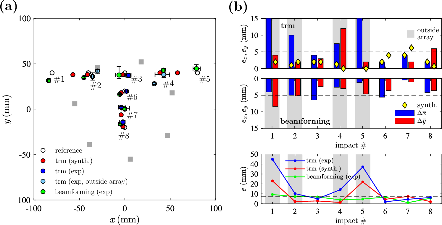 The TRM method was applied to acoustic waves for mapping pendulum impacts with known boundary conditions and sudden cracking sound events, where the boundary conditions were not known a priori. Using the TRM method, the pendulum impact locations could be mapped with small spatial deviations in the millimeter range, compared to the reference pendulum impact locations (see Fig. 13a, b). As the impacts were repeated with deviations of approx. 5 mm, the overall mapping accuracy achieved (\(e \le 7.1\) mm) for sound events located within the microphone array (impacts #3, #6, #7 and #8 in Fig. 13a, b) is considered as accurate. For pendulum impacts outside the microphone array (impacts #1, #2, #4, and #5), the TRM method tends to focus within the array, with significant spatial deviations in the x-direction (\(e_{x}>15\) mm, impacts #1 and #5) compared to the reference source positions. Such behavior was already reported by other authors [25, 26, 32]. In addition, the horizontal experimental deviations shown in Fig. 5b contribute unfavorably to the deviation in x-direction. The beamforming results demonstrated a consistently good localization performance with an overall error \(e \le 7.1\) mm with isolated outliers. The beamforming technique performed robustly when applied to pendulum impacts located outside the microphone array.