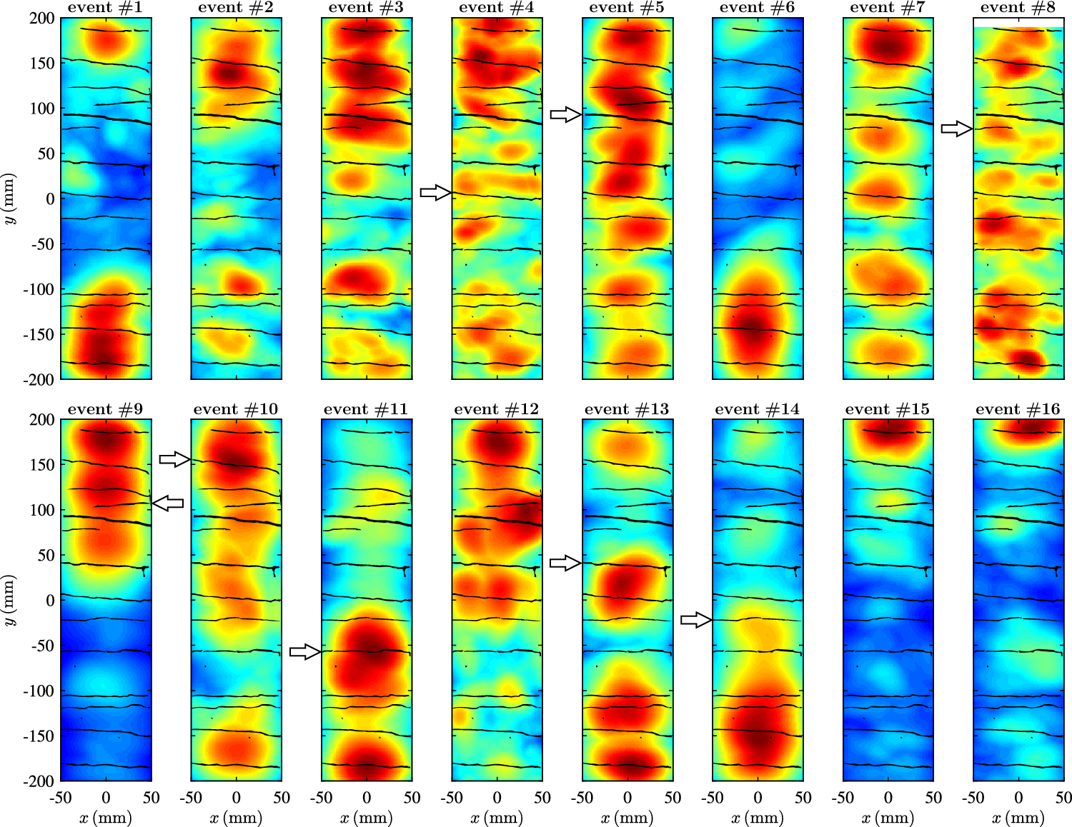 Chronological evolution of \(\bar{p}_{\max }(\textbf{x})\) due to cracking sound events #1 through #16. The colormaps are superimposed with the crack pattern after the failure of the test specimen No. 19. The colorbar is identical to the one in Fig. 2. The monitored cracks are marked by arrows in the relevant events and at y-location in accordance with Fig. 9