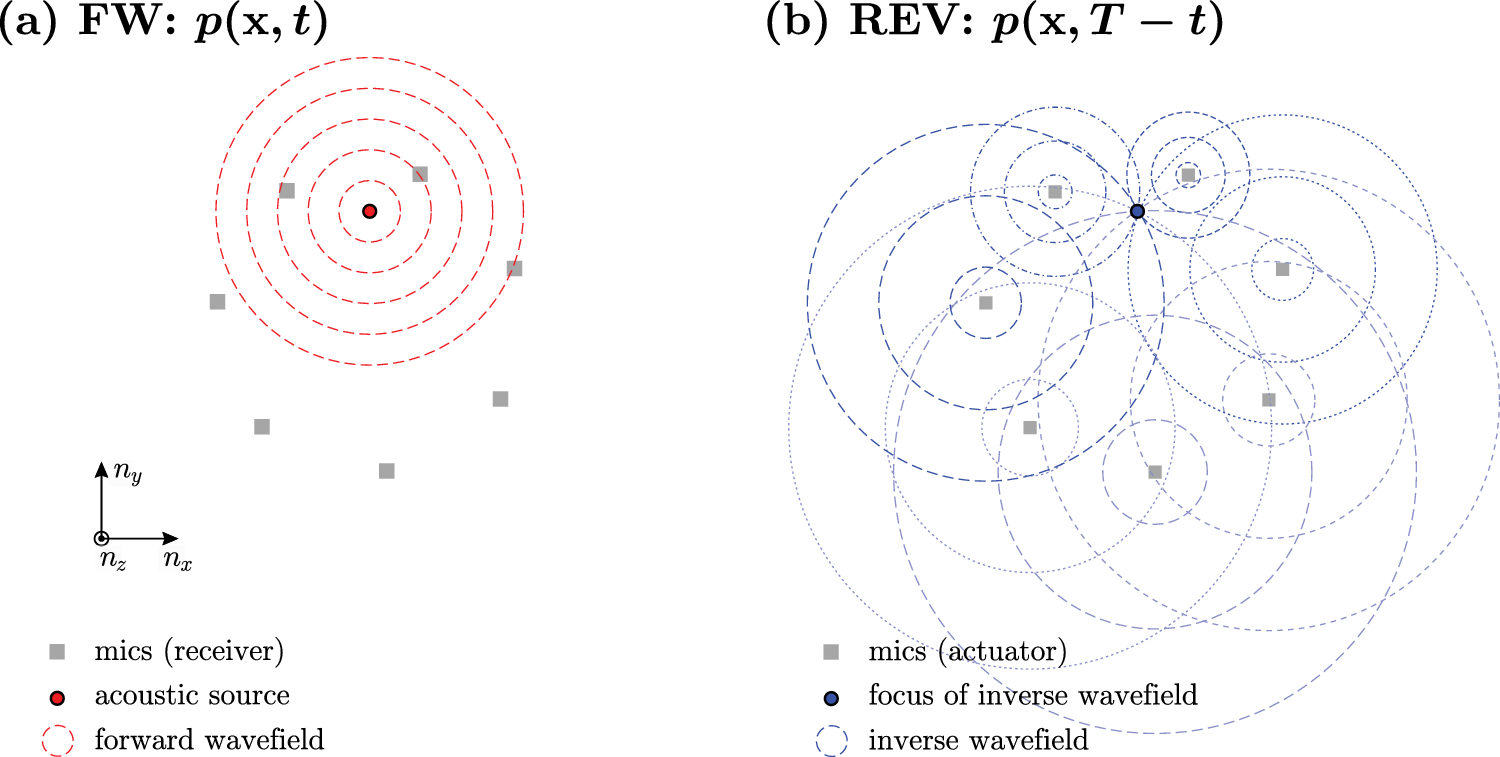 In the forward procedure (numerical or experimental), acoustic signals due to a sound event are received at defined microphone positions and reversed with respect to time. In the inverse simulation, the microphone positions serve as excitation points for the numerical model. The re-emitted pressure wavefields will interfere with each other and focus on the location of the initial acoustic source.