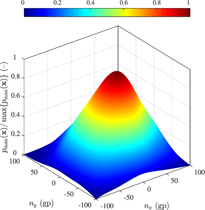 The maximum pressure magnitude \(p_{\max }\) is stored for every point \(\textbf{x}=[n_{x},n_{y},n_{z}]\) on the spatial domain \(\Omega \), and the entire simulation time T. Equation (2) can be written in a normalized form