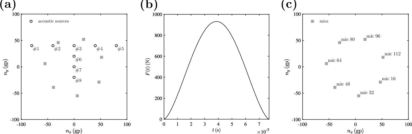 where \(\bar{p}_{\max }\) is the global maximum of \(\bar{p}_{\max }(\textbf{x})\). In Fig. 2, \(\bar{p}_{\max }\) depicts the location of the initial acoustic source on the numerical domain, i.e. at [0, 20, 0] grid points (gp).