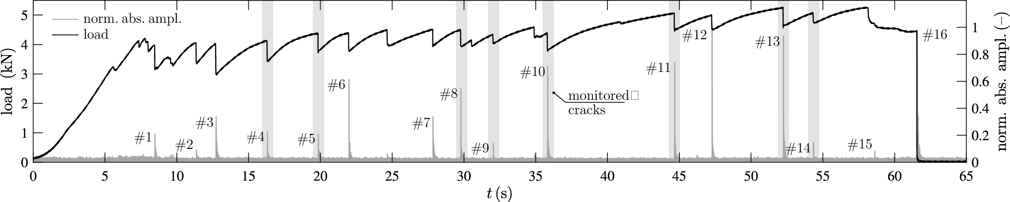 Load-time curve of the axial tensile test (specimen No. 19) versus the accumulated microphone recordings of fourteen microphones, and selected sixteen cracking sound events (#1 through #16). Eight monitored cracks are marked