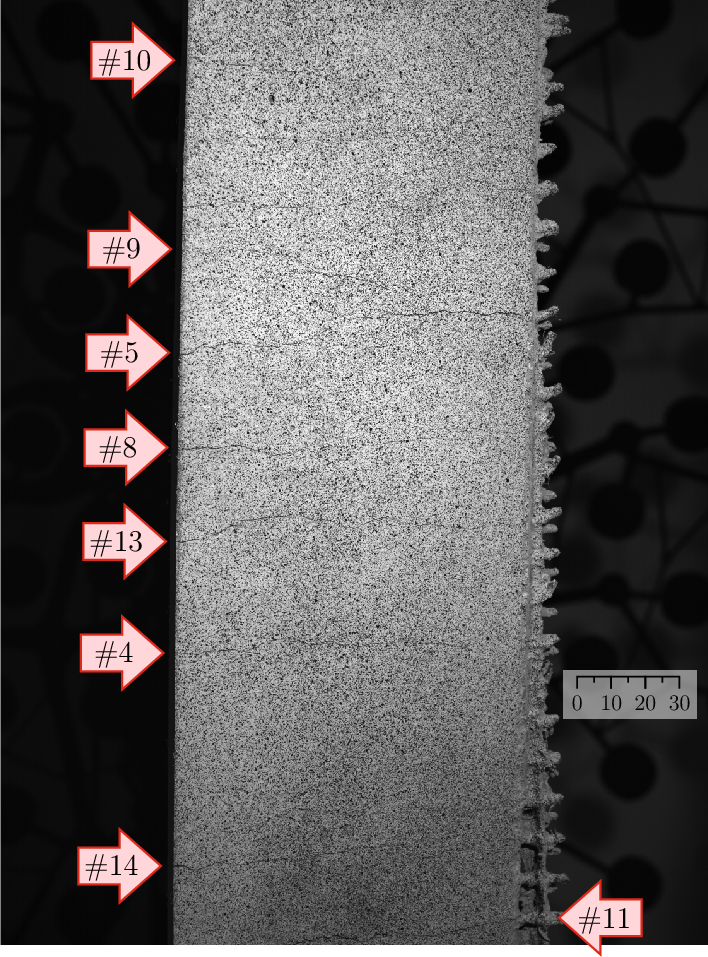 Picture of the monitored area taken at approx. time \(t=55\) s during the axial tensile test highlighting the eight monitored cracks, respectively cracking sound events
