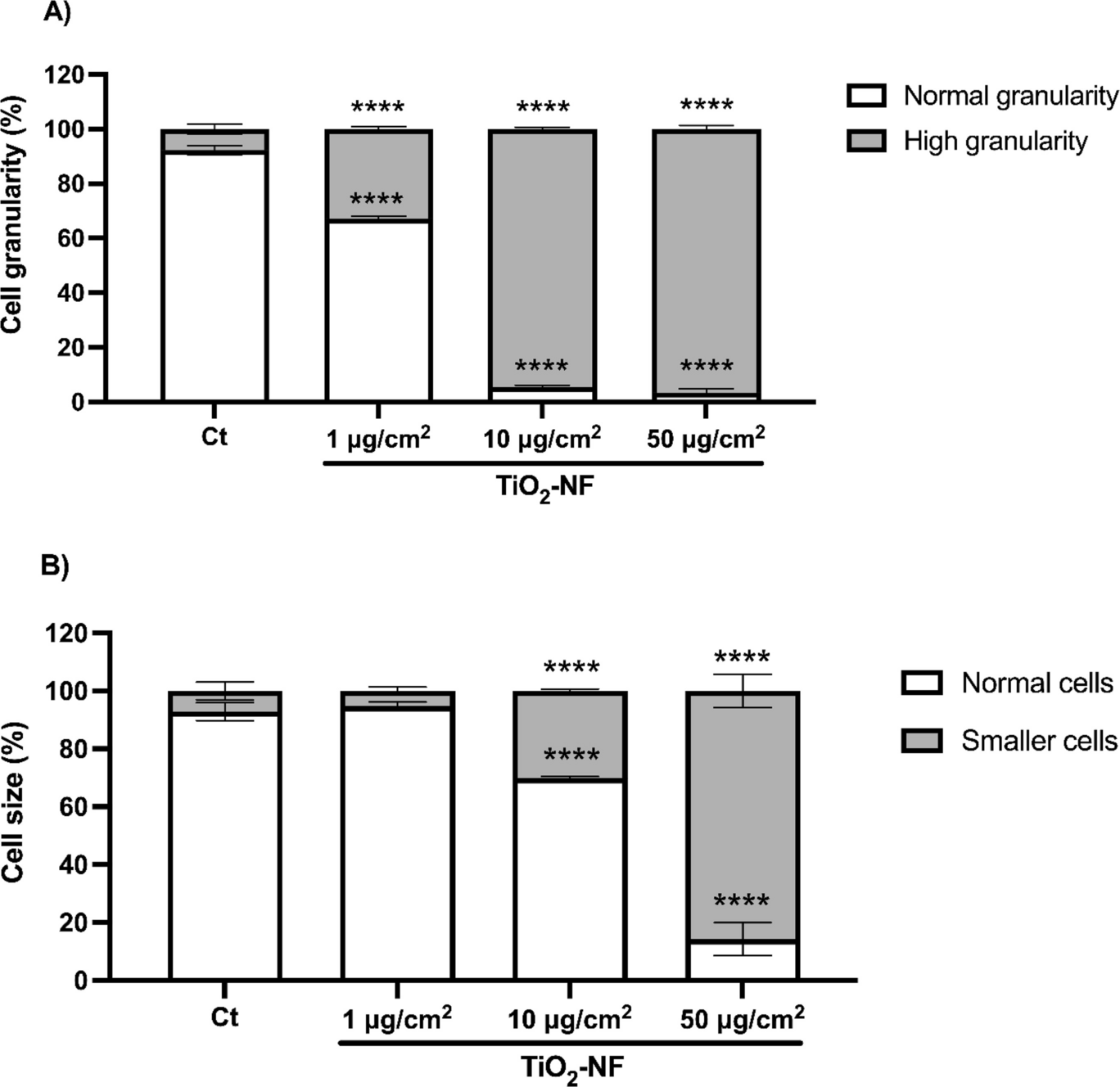 TiO2-NF increased cell granularity and decreased cell size after 24 h of exposure. According to the distribution of the cell population, the granularity was categorized as either normal or high granularity. For the cell size, the cells were classified into normal and smaller cells. Three independent experiments were performed, and data are presented as mean ± standard deviation (%). p**** < 0.0001 vs Ct group