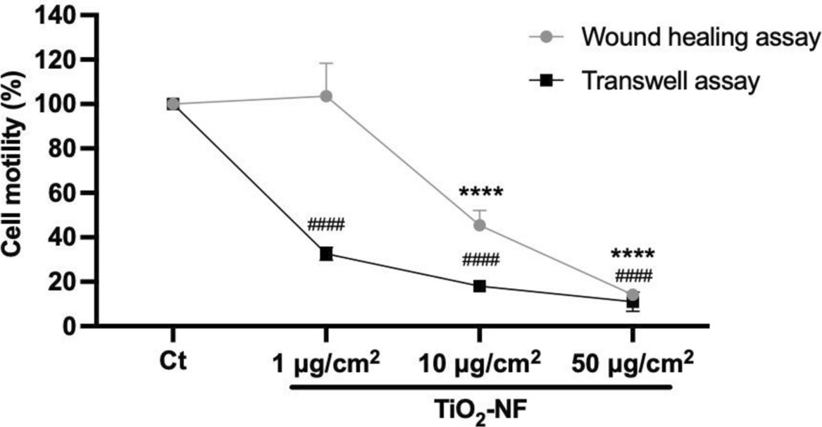 Cell motility was assessed using both wound healing and transwell assays. For the wound healing assay, cells were cultured in a 12-well plate and after 24 h, a wound was created in the cell monolayer using a 20–200-µL sterile pipette tip. The culture was then washed with 1 × PBS to remove any detached cells after exposure to TiO2-NF for 24 h. The cells were fixed with 4% paraformaldehyde for 20 min, washed with PBS, and then stained with Hoechst (1:1500 dilution) for nuclei detection. Cell motility was quantified by measuring the area covered by migrating cells using ImageJ software and the cell-covered area was expressed as a percentage of the initial wound area. The images were acquired by an AxioCam MCR/ZEISS Axio Vert A1 fluorescence microscope at 20 × magnification. For the transwell assay, cell motility was evaluated using a 24-transwell plate (3421, Corning). Briefly, cells were seeded on the apical side of the transwell and incubated for 24 h. Afterward, the cells were exposed to TiO2-NF for an additional 24 h in F-12 K cell culture medium supplemented with 1% FBS on the apical side, while the basolateral side contained F-12 K medium supplemented with 10% FBS to establish a chemoattractant gradient. The cells that migrated to the basolateral side were stained with crystal violet solution for 5 min, washed, and quantified with a counter under an optical microscope. The motility of cells in the control group was considered 100% to normalize the data. Three independent experiments were performed, with three biological replicates per experiment.