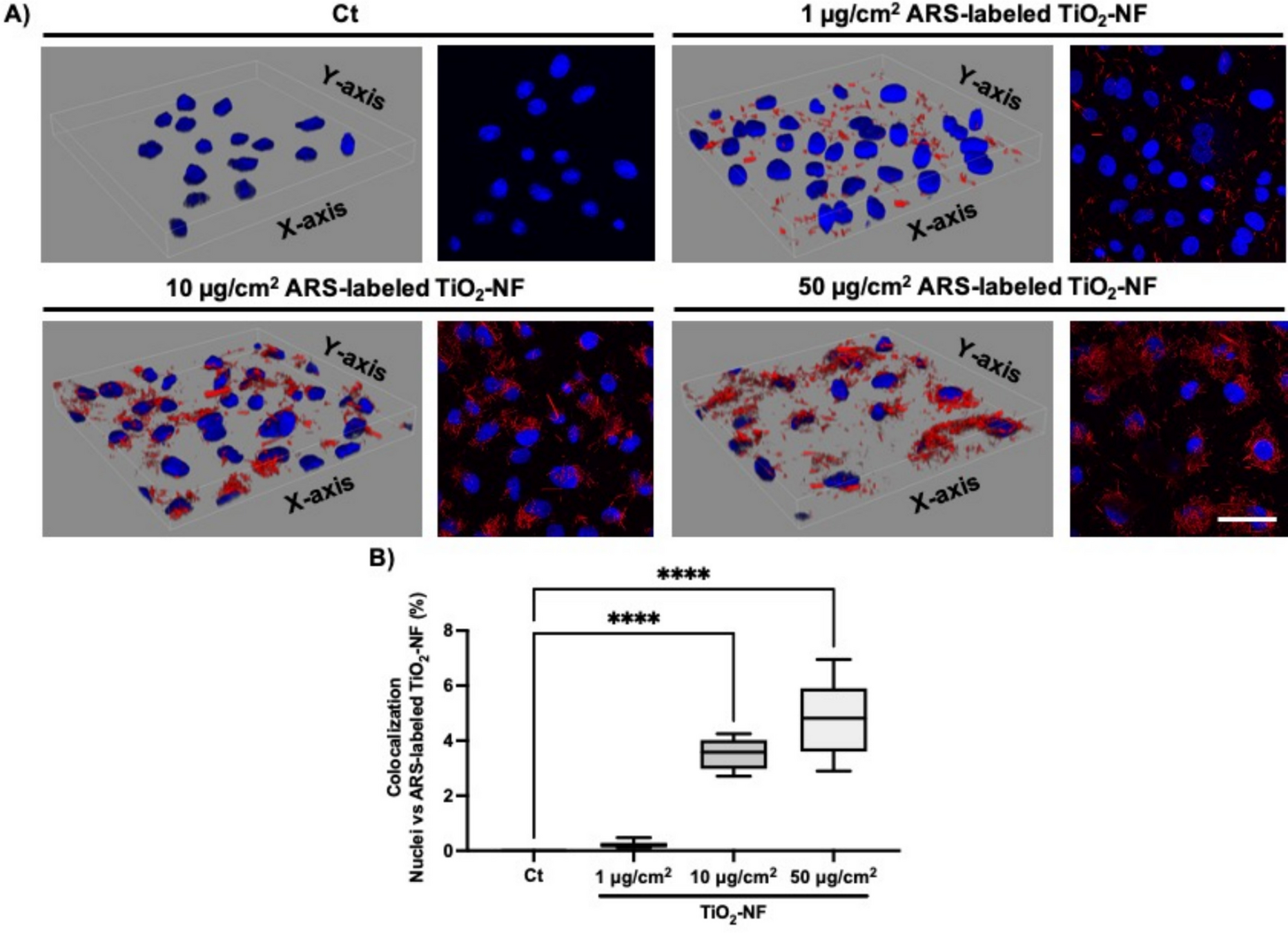 ARS-labeled TiO2-NF (red) colocalized with nuclei (blue) of lung adenocarcinoma cells observed in A 2D and 3D images. B Colocalization rate between ARS-labeled TiO2-NF and nuclei. Three independent experiments were performed, in each experiment 10 images were analyzed and data are presented as mean ± standard deviation (%). p**** < 0.0001 vs Ct group. Scale bar = 10 µm