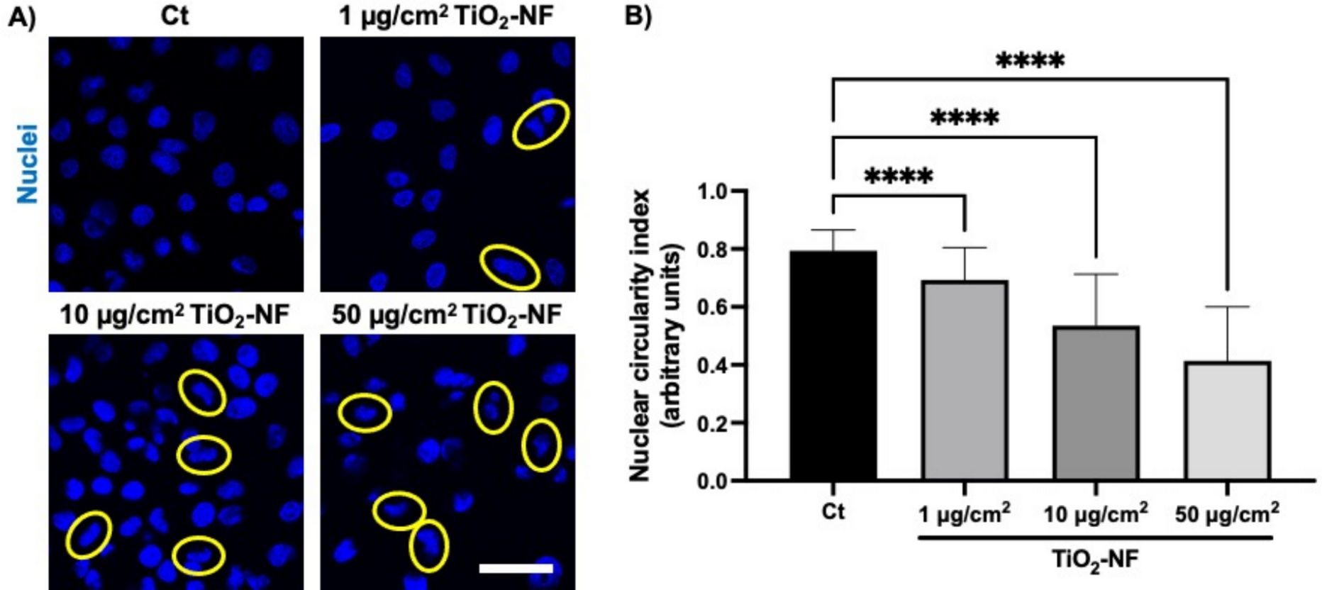 The internalization analysis revealed a concentration-dependent perinuclear localization of TiO₂-NF, accompanied by irregular nuclear shapes. The nuclei of lung adenocarcinoma cells are typically spherical to oval under normal conditions. For this reason, the circularity parameter was used to analyze nuclear deformation. This parameter ranges from 0 to 1, and a value of 1 indicates a perfect circular shape, while values close to 0 describe irregular non-spherical objects. The images obtained from nuclei stained with Hoechst of lung adenocarcinoma cells were processed to 8-bit; threshold and outline images in the ImageJ Software and the circularity values were obtained. Unexposed cells displayed a circular to oval nuclear shape and a value of circularity less than 1 is expected. We observed nuclear deformation of lung adenocarcinoma cells after TiO2-NF (shown by the yellow ellipse; Fig. 6A). The control group showed a nuclear circularity of 0.79, and this value decreased to 0.69, 0.54, and 0.41 in cells exposed to 1 µg/cm2, 10 µg/cm2, and 50 µg/cm2 of TiO2-NF, respectively. These results showed nuclear shape after TiO2-NF treatments (Fig. 6B).