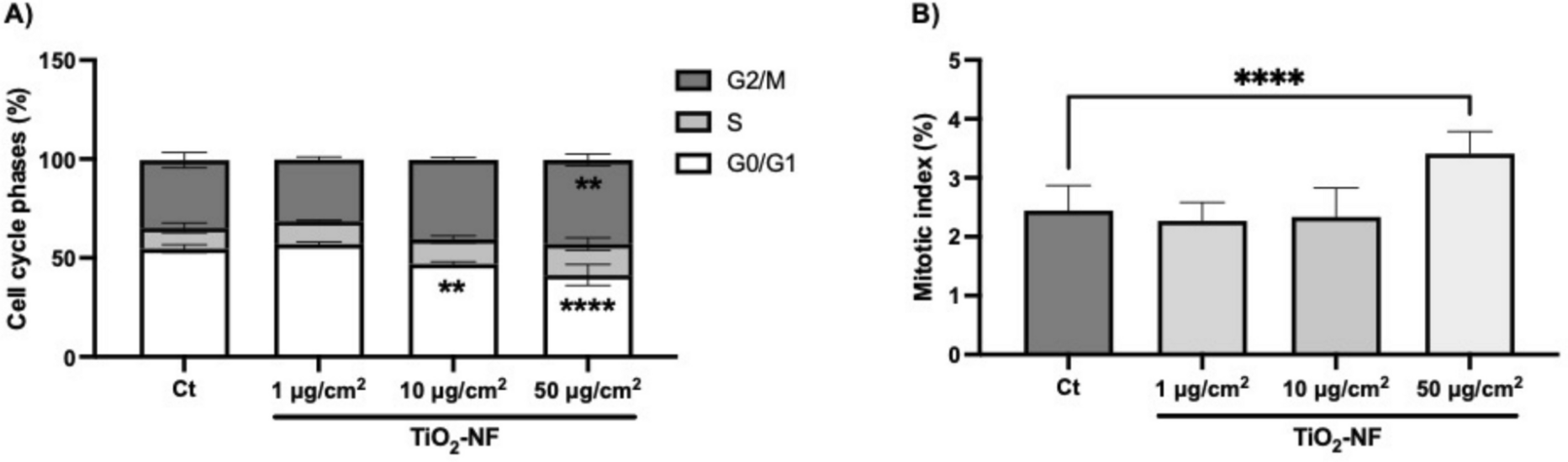 TiO2-NF altered the cell cycle phases and increased the mitotic index in lung adenocarcinoma cells. A After TiO2-NF exposure, the cell cycle phases (G0/G1, S, and G2/M) were analyzed by propidium iodide staining. B Mitotic index was obtained based on the number of cells undergoing mitosis by analyzing 3000 cells per independent experiment. Three independent experiments were performed, and data are presented as mean ± standard deviation (%). p** < 0.0067, p**** < 0.0001 vs Ct