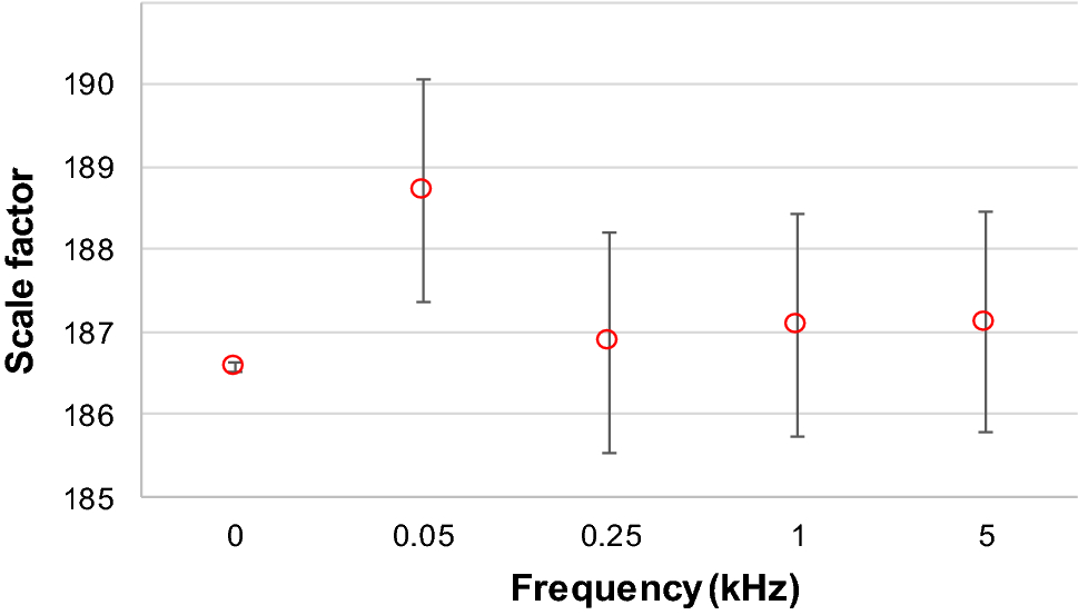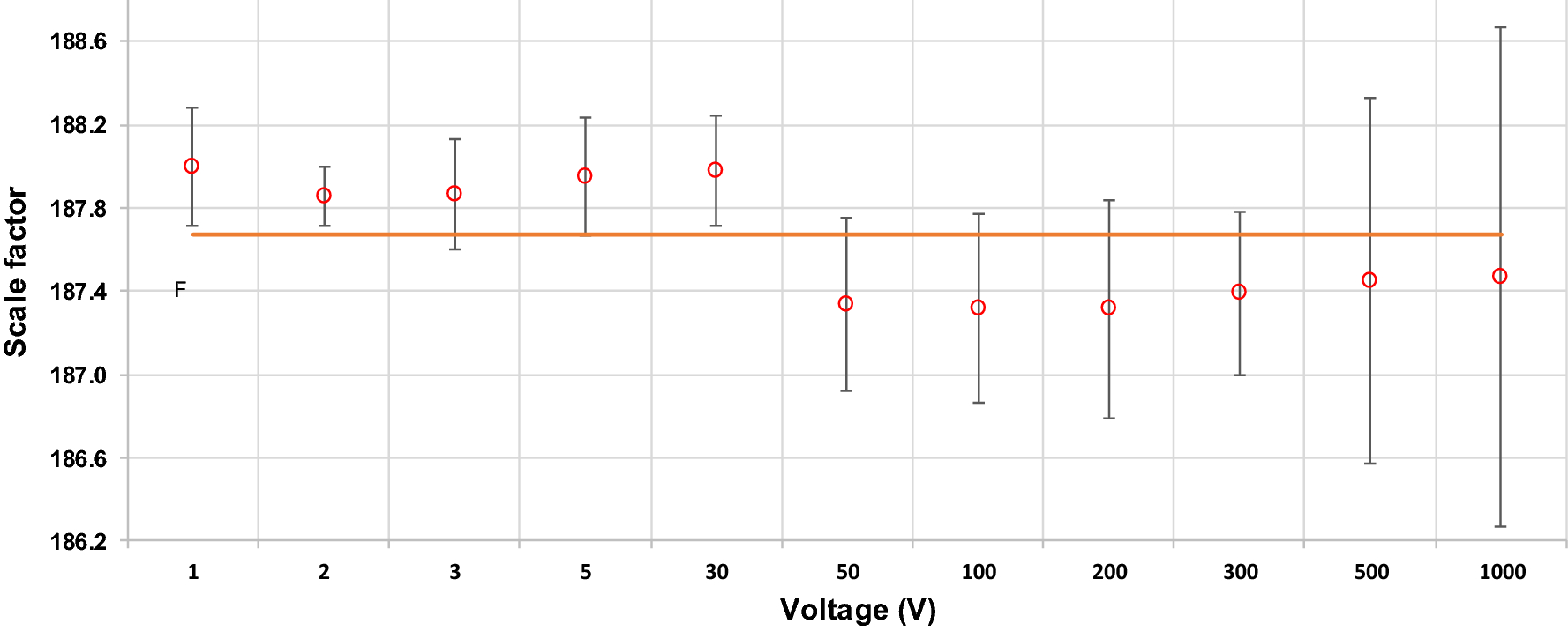 To complete the calibration, the scale factor has been measured in a wide frequency range for each voltage. In Fig. 12, the behaviour of the scale factor vs. voltage is shown.