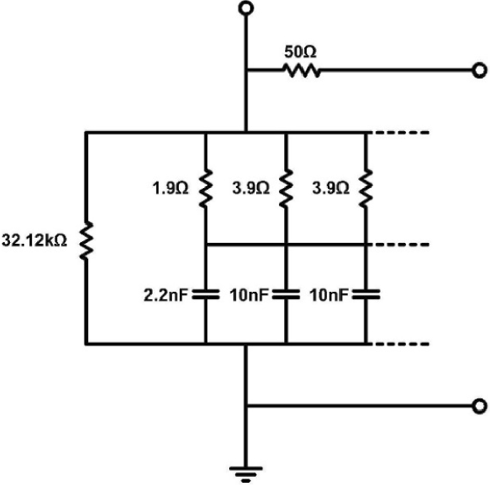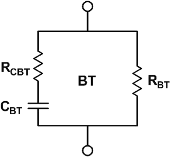 Scheme of the low-voltage arm of the original divider with concentrated parameters. It consists in a resistor RBT = 30.15 kΩ, a resistance network forming RCBT = 0.2287 Ω and a capacitance network forming CBT = 152.2 nF