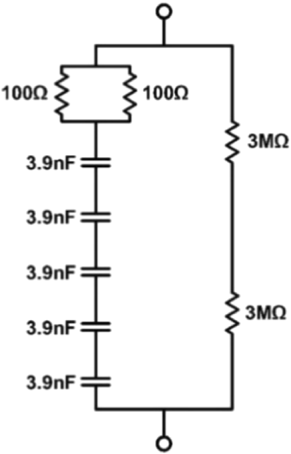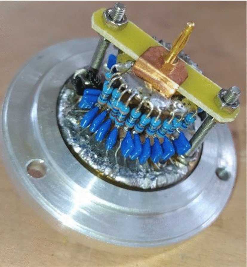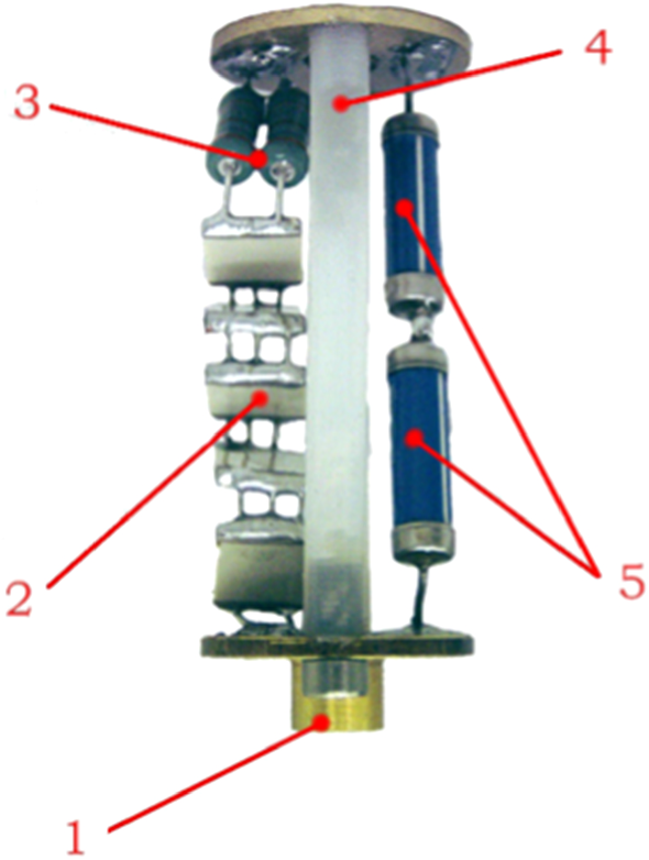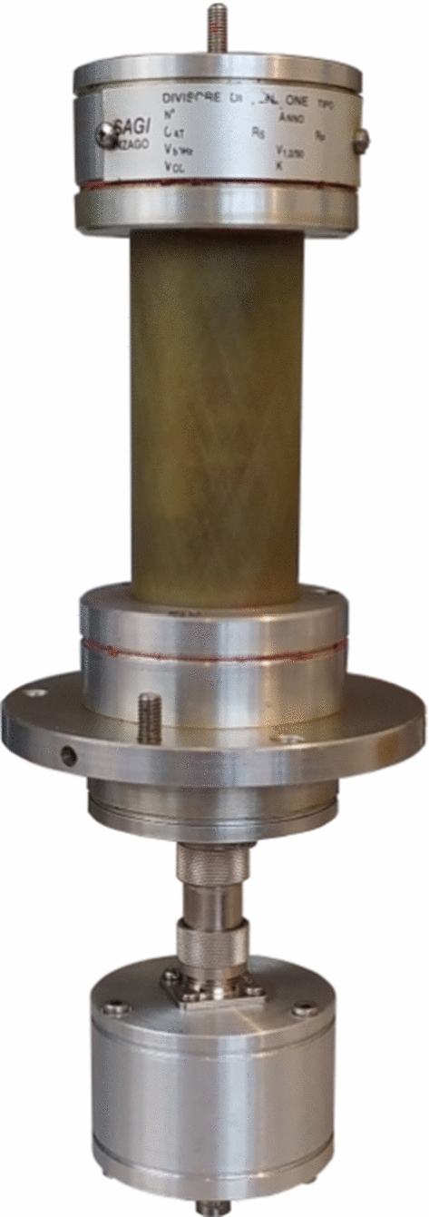 Voltage dividers have played and still play a strategic role in metrology for low and high DC [5‐14], AC [15‐18] and impulse voltages [19‐21] At INRIM, a test set-up involving a divider with a sinusoidal and a LI generators has been simulated with the LT-spice program. Simulations with single generators (LI and sinusoidal) and with composite voltages have been carried out. After this stage, a resistive–capacitive divider (compensated voltage divider), available at the INRIM High Voltage and High Power Laboratory (LATFC), has been selected to be modified to comply with the requirements of [2] in terms of step response and scale factor and to employ it in a test set-up with composite voltages. This work followed another resistive–capacitive divider realization for medium voltages at INRIM [22]. Figures 1, 2, 3 show, respectively, the scheme of the high-voltage arm and the internal photographs of the high- and low-voltage arms of the original divider. Figure 4 shows instead the scheme of the low-voltage arm. The resistors on the capacitive side regulate the dynamic behaviour of the high-voltage arm, as their values affect the time constant of the RC circuit. As shown in Fig. 1 the total resistance is RAT = 6 MΩ, while the nominal capacitance is CAT = 780 pF.