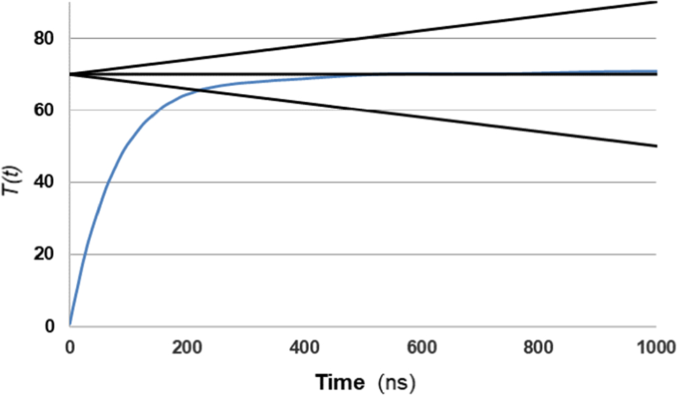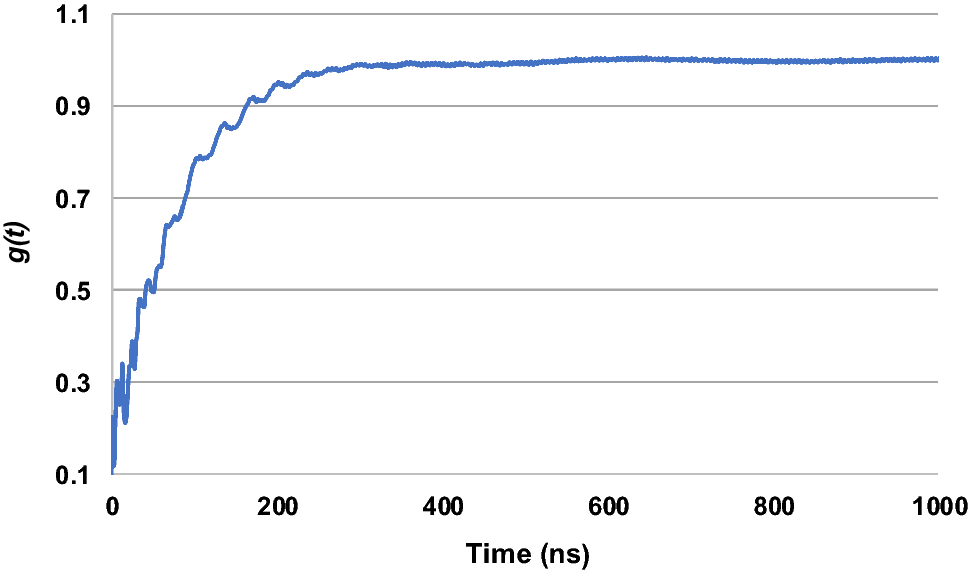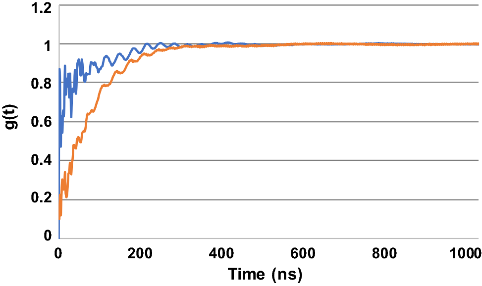 Divider step response after the third change. In orange and blue, respectively, the behaviour of g(t) before and after the changes on the divider