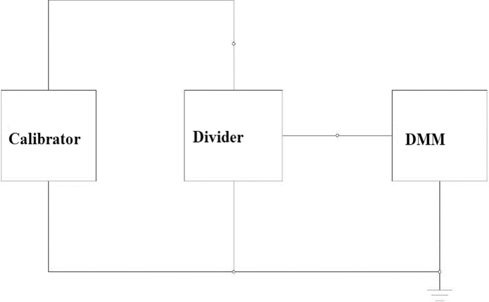 Scheme of the measurement set-up for the scale factor measurement. The calibrator supplies the divider terminals while the DMM measures the voltage of the low-voltage side of the divider