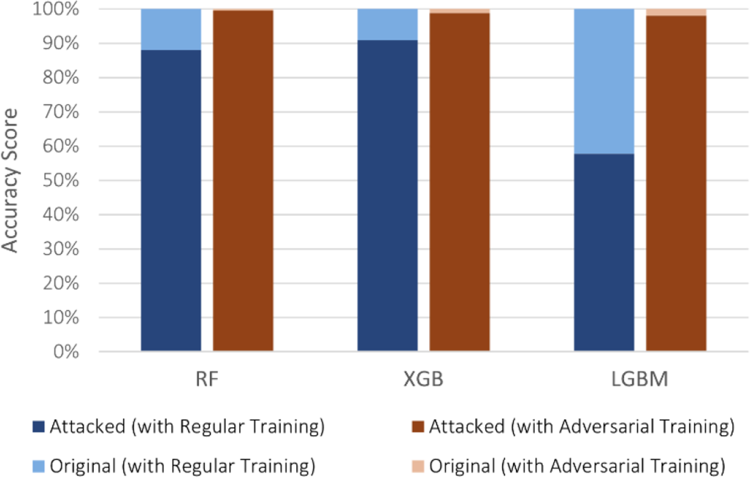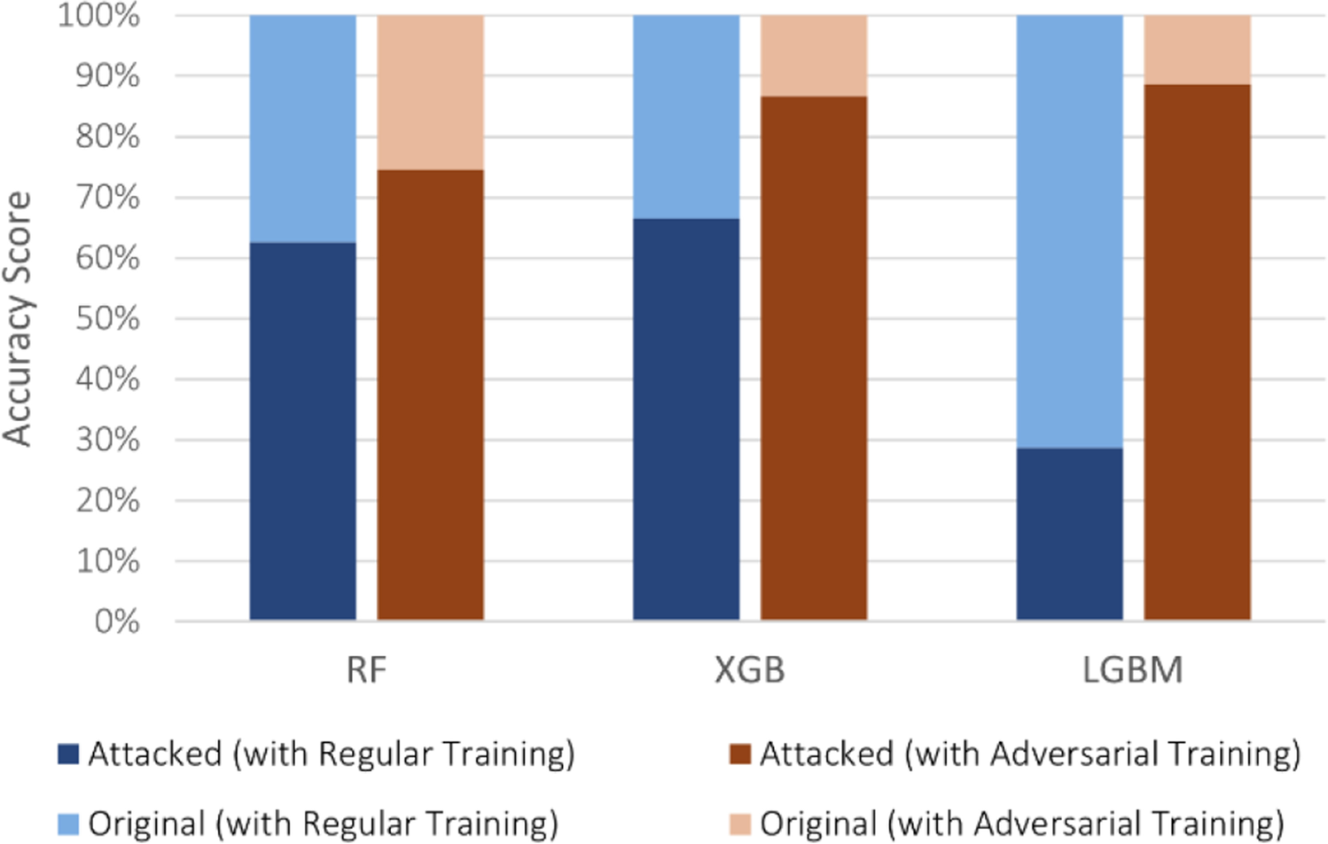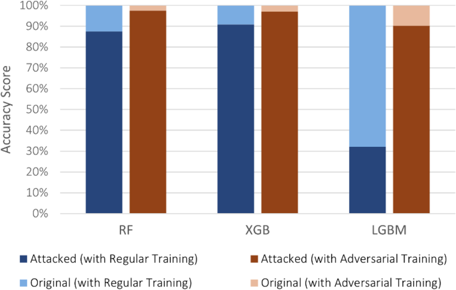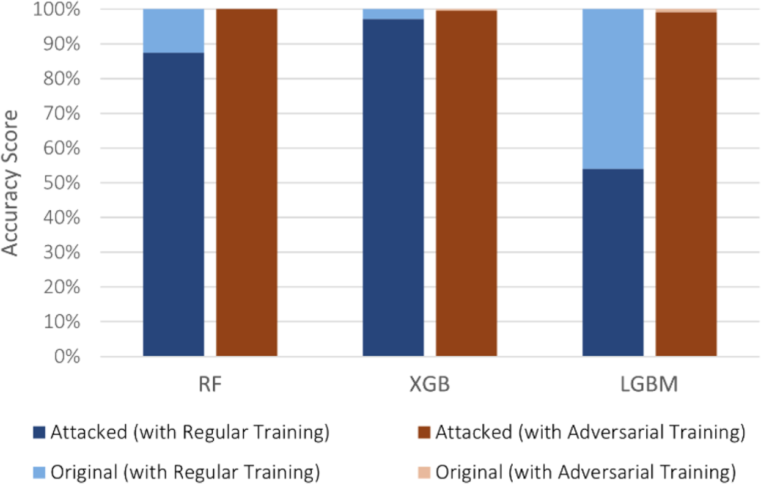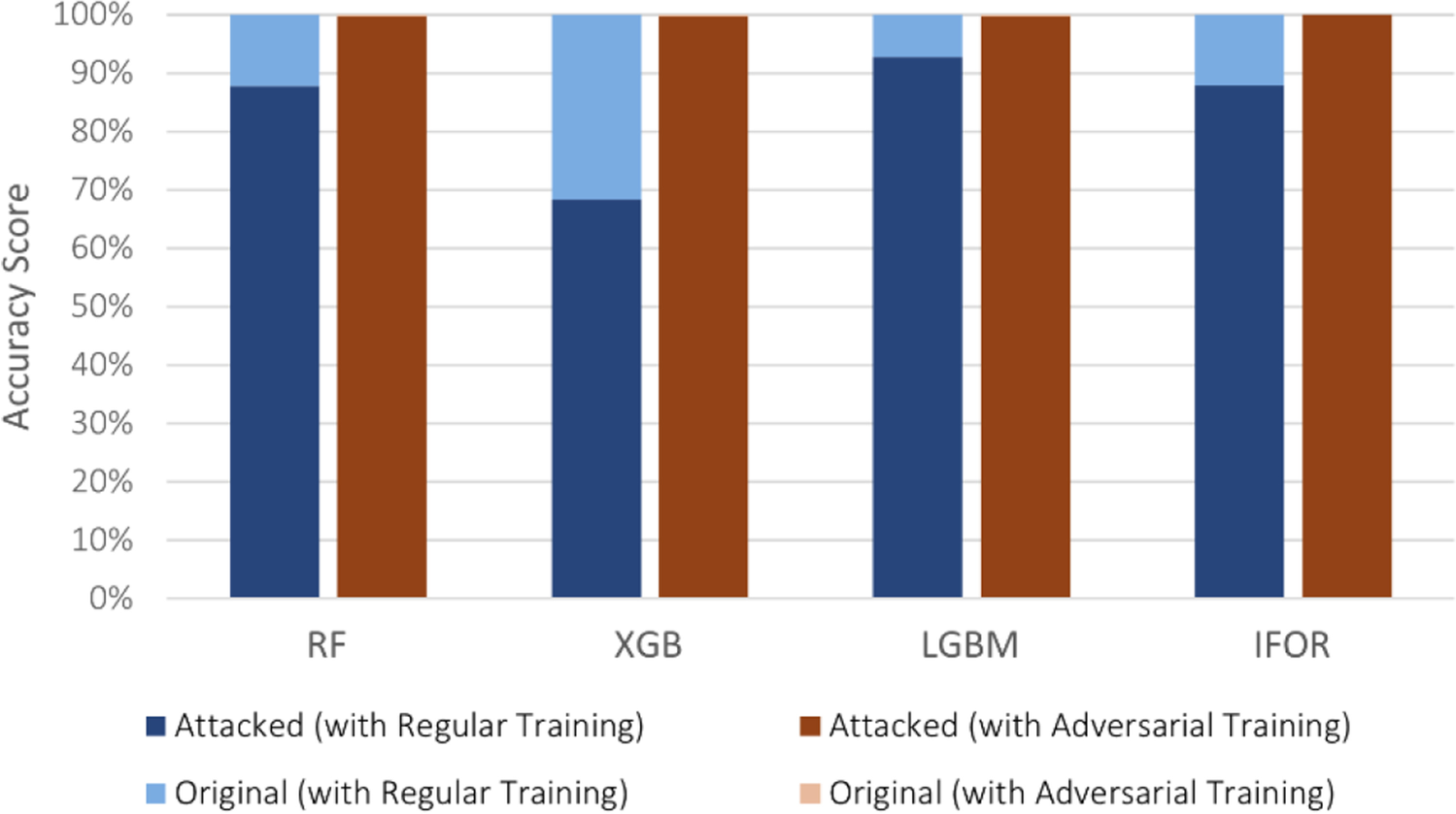 In the multi-class scenario, the targeted and untargeted attacks had different impacts on a model’s performance. The former caused malicious flows to be solely predicted as the benign class, whereas the latter caused malicious flows to be predicted as different classes, including other cyber-attack classes. Both attacks decreased the accuracy of the three supervised models on IoT-23, with LGBM being significantly more affected. Nonetheless, it can be observed that its targeted accuracy, 57.78%, was significantly higher than the untargeted, 32.11%, with more misclassifications occurring between different cyber-attack classes. Therefore, despite LGBM being susceptible, the benign class was more difficult to reach in multi-class intrusion detection. Even though performing adversarial training further increased the high scores of XGB, it was surpassed by RF on the targeted attack, which achieved 99.97% (see Figs. 4 and 5).