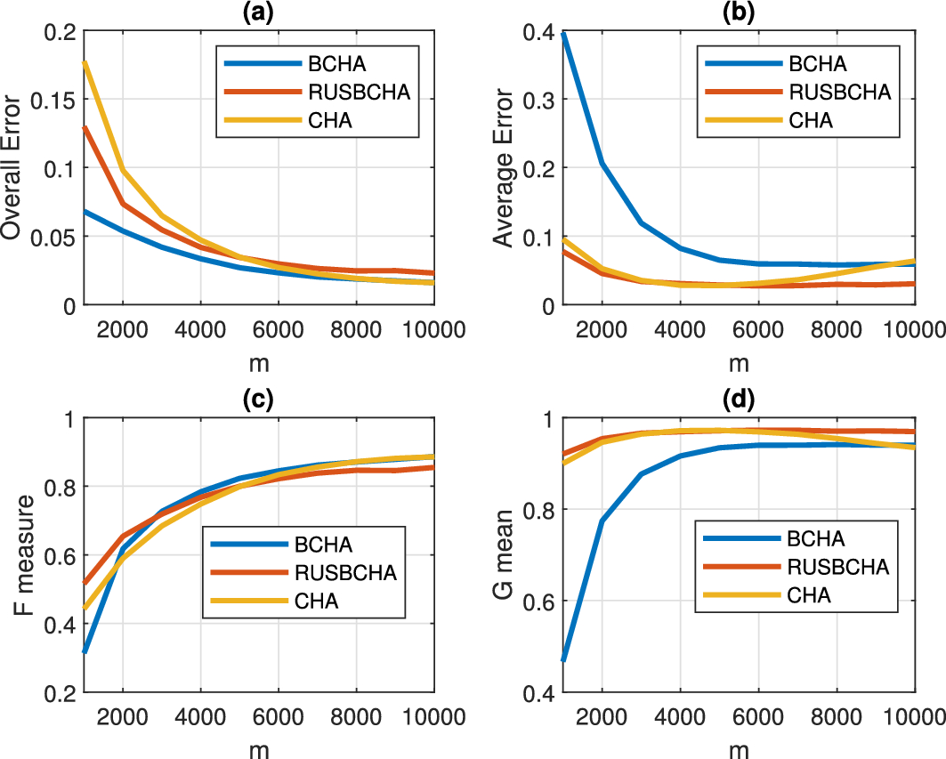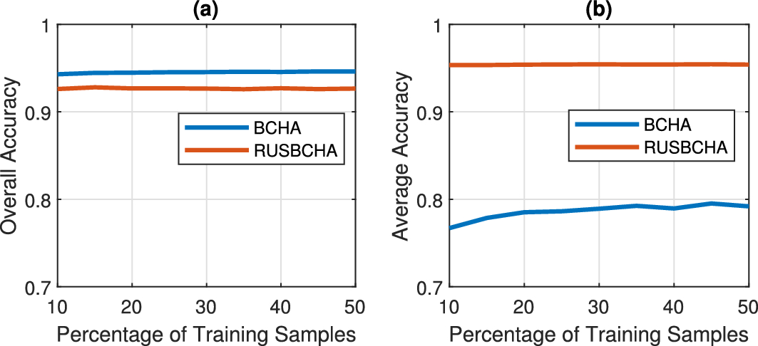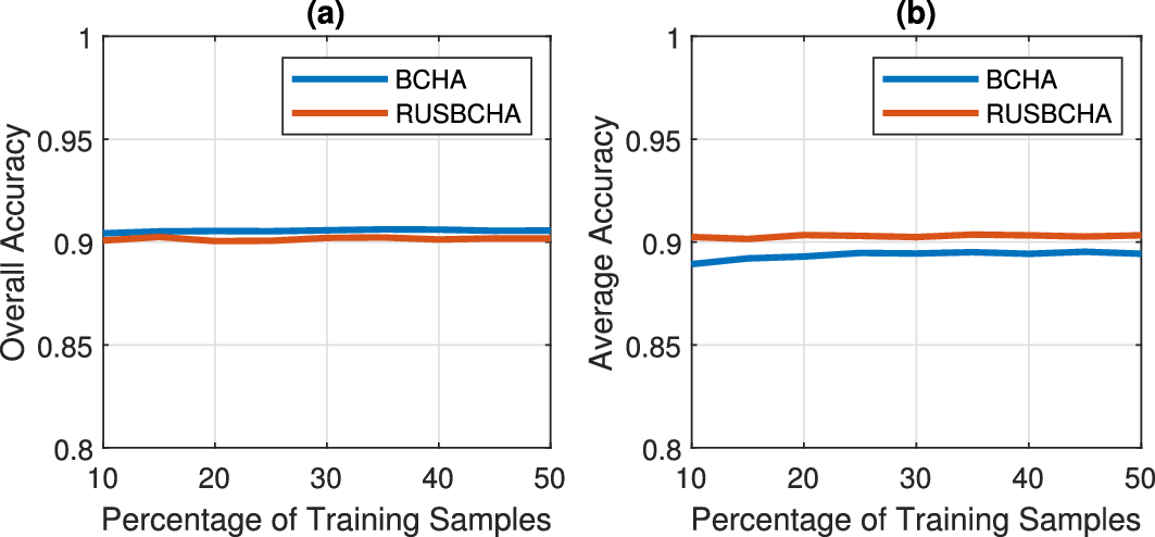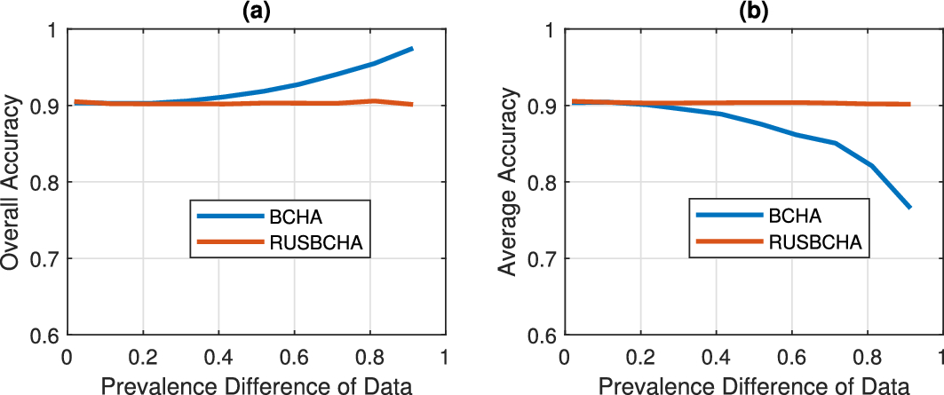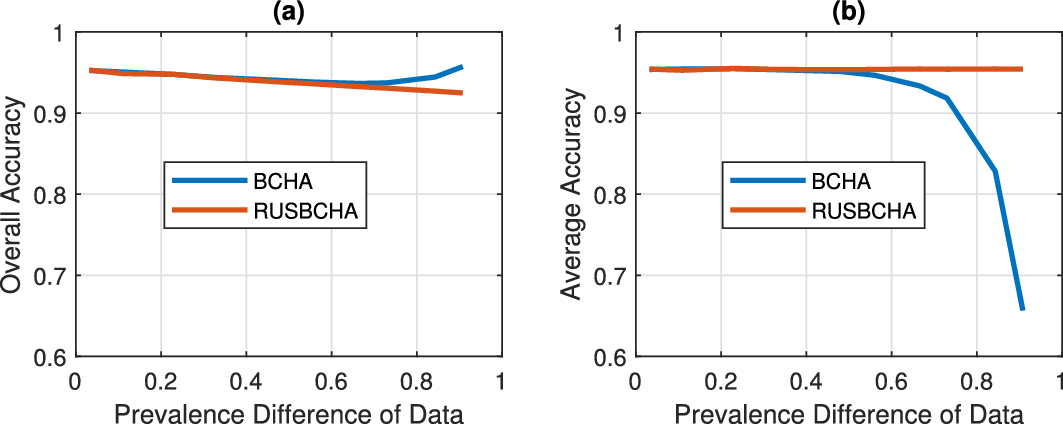 It is observed from Fig. 10a that the OA of both BCHA and RUSBCHA are similar up to 0.6 prevalence difference. However, afterward, there is a minor improvement of OA for BCHA approach in comparison with RUSBCHA approach. From Fig. 10b, it can be observed that both BCHA and RUSBCHA performances are similar up to 0.5 prevalence difference. However, afterward, there is a sharp decline of AA for BCHA in comparison with RUSBCHA.