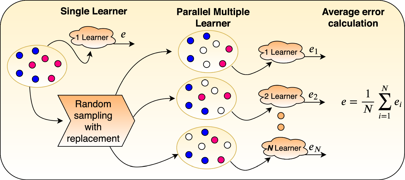 Overview of bagging classifier: multiple learners are created by generating additional data points. The new data points are created randomly with a uniform probability as before. Generally, the created N learners are parallel and are further averaged to obtain the final learning error defined as \(e=\frac{1}{N}\sum _{i=1}^{N} e_i\)