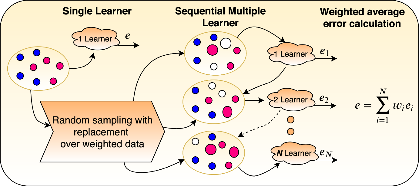 Overview of boosting classifier: similar to the bagging approach, the boosting classifier also generates multiple data points. But, unlike parallel in bagging, the boosting approach sequentially learns the error from the previous learner and assigns a higher weight to the miss classified data, and random sampling with weighted replacement is carried out. Also, another set of weights assigned to the learners are further accumulated to find the final weighted average error defined as \(e=\sum _{i=1}^{N} w_i e_i\)