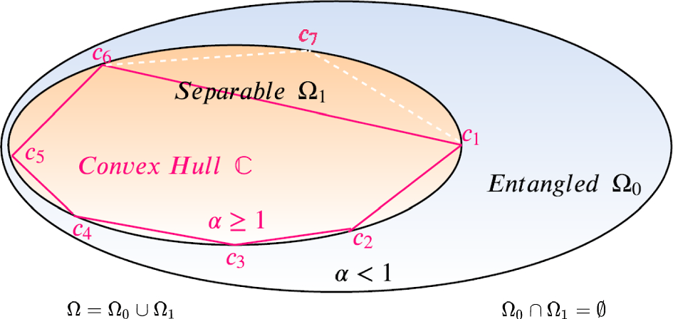 The set of all separable states, \(\Omega _1\), is convex and compact, and its exterior points are all pure product states. Using this fact, one can sample \(\Omega _1\) using convex hull (\(\mathbb {C}\)) of m number of product states, \(\{\varvec{c}_i\}\in \mathcal {V}\), i.e., \(\mathbb {C}:=\textrm{conv}\{\varvec{c}_i~|i=1,\dots , m\}\). The \(\mathbb {C}\) is the CHA of \(\Omega _1\), and one can decide if an unknown state \(\rho \) is separable or not by examining whether its feature vector \(\varvec{x}\) is in \(\mathbb {C}\). Equivalently, it is the solution of following linear programming:
