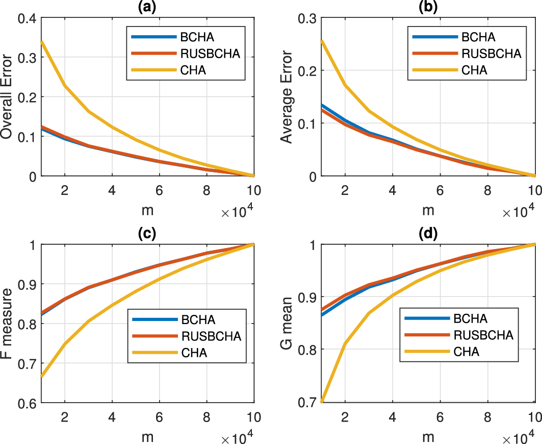 From the results in Fig. 10 and Fig. 11, it can be observed that the performance of the proposed RUSBCHA approach is consistent (almost a straight line) over varying prevalence differences of data. So, it can be concluded that the performance of RUSBCHA is not heavily affected by the data imbalances.