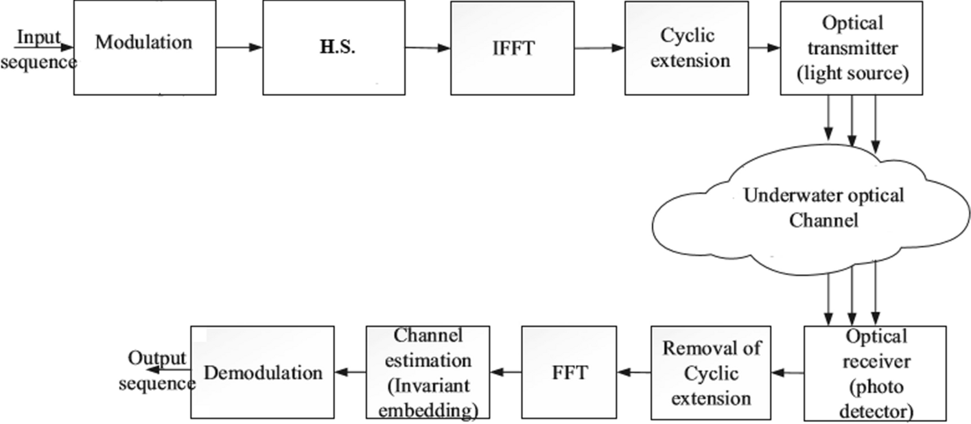 The format of this essay is as follows. First, the related work section discusses different studies and authors’ contributions in this field. Section 2 illustrates the optical channel which shows the general characteristics for underwater system and a comparison between different types of water. The modulation techniques are explained in Sect. 3 in details for both of DCO-OFDM and ACO-OFDM. Section 4 demonstrates the system model, showing general feature of the system. After that, in Sect. 5, both WDGF and CEAPF models are discussed to get the response of the channel, impulse response. The KF algorithm is explained in Sect. 6 to be applied. Simulation analysis and corresponding results are displayed and discusses in Sect. 7. Section 8 is devoted to the main conclusion.