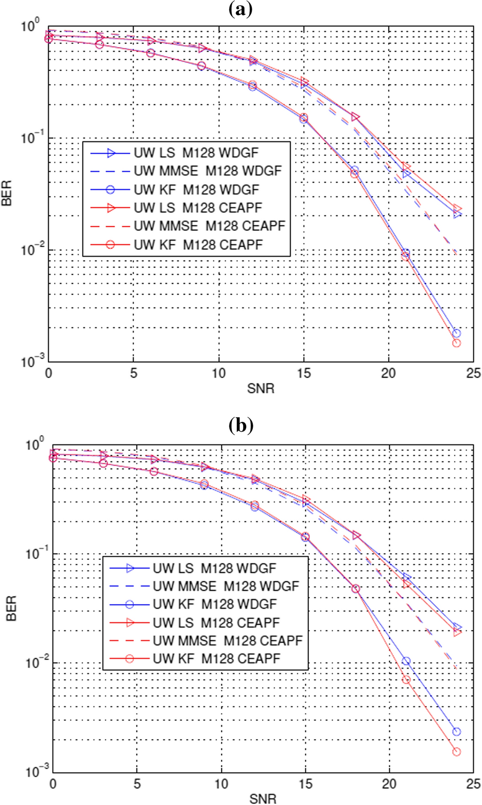 Figure 3 shows the comparison between the different types of channel estimation methods (LS, MMSE and KF) for the harbor water with (a) FoV = 20°, (b) FoV = 180°, for both modeling channels and using DCO-OFDM modulation technique. Using CEAPF channel modeling achieves tiny, better results than WDGF and using the KF channel estimation method which increases the accuracy and decreases the bit error rate than other channel estimation methods LS and MMSE. In Fig. 3.a, the simulation is calculated for M = 128 and FoV = 20°. Here, for BER = 10−1 and using KF and CEAPF, KF achieves SNR of 16 dB, while MMSE and LS achieve SNR of 19 and 19.5 dB, respectively.