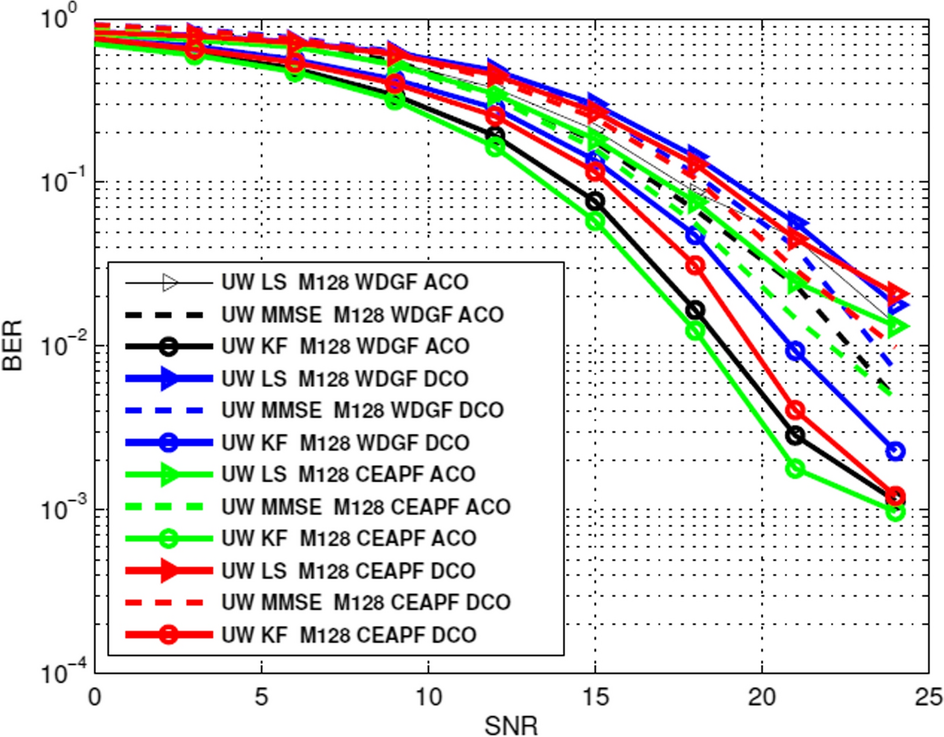 In (Xu et al. 2018), the proposed channel estimation underwater system at BER = 10−2 get the improvement than LS method, where SNR = 20 dB. By comparing our system with the same parameters of (Xu et al. 2018) can detected that the SNR in our proposal achieves for ACO-OFDM, CEAPF with KF better result than (Xu et al. 2018) where at BER = 10−2, SNR = 18 dB with improvement by nearly 10%. In (Eman et al. 2018), there is a same comparison between ACO-OFDM and DCO-OFDM for indoor optical channel for three estimators KF, MMSE and LS. The difference between this reference and our proposal is the optical transmission meduim, where in (Eman et al. 2018), the meduim is air while the meduim in our work is underwater. In (Eman et al. 2018), ACO-OFDM outperforms DCO-OFDM for M = 128 when using KF by about 11.4%, while in this paper, ACO-OFDM achieves improvement over DCO-OFDM between 9.3 and 13.3% related to the channel modeling used. In (Wang et al. 2016), the authors used OFDM in the acoustic underwater transmission channel with QPSK modulation technique. The reference used channel super-resolution neural network (CSRNet) to improve the channel estimation over LS.