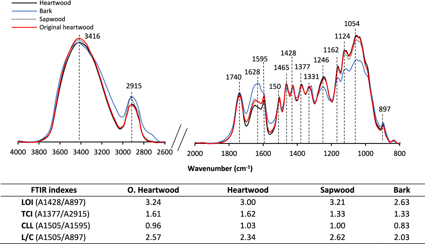 O.Heartwood, heartwood, sapwood, and bark-dried samples were ground and analyzed by transmission FTIR carried out using a Nicolet 6700 spectrometer and Omnic software (Thermo Fisher Scientific, USA). KBr pellets were prepared by mixing the sample with potassium bromide. Spectra were obtained through 16 scans from 4000 to 400 cm−1 with 4 cm−1 spectral resolution while subtracting background spectra measured in the air. Spectra were then corrected by baseline subtraction and area normalization to compare samples.
