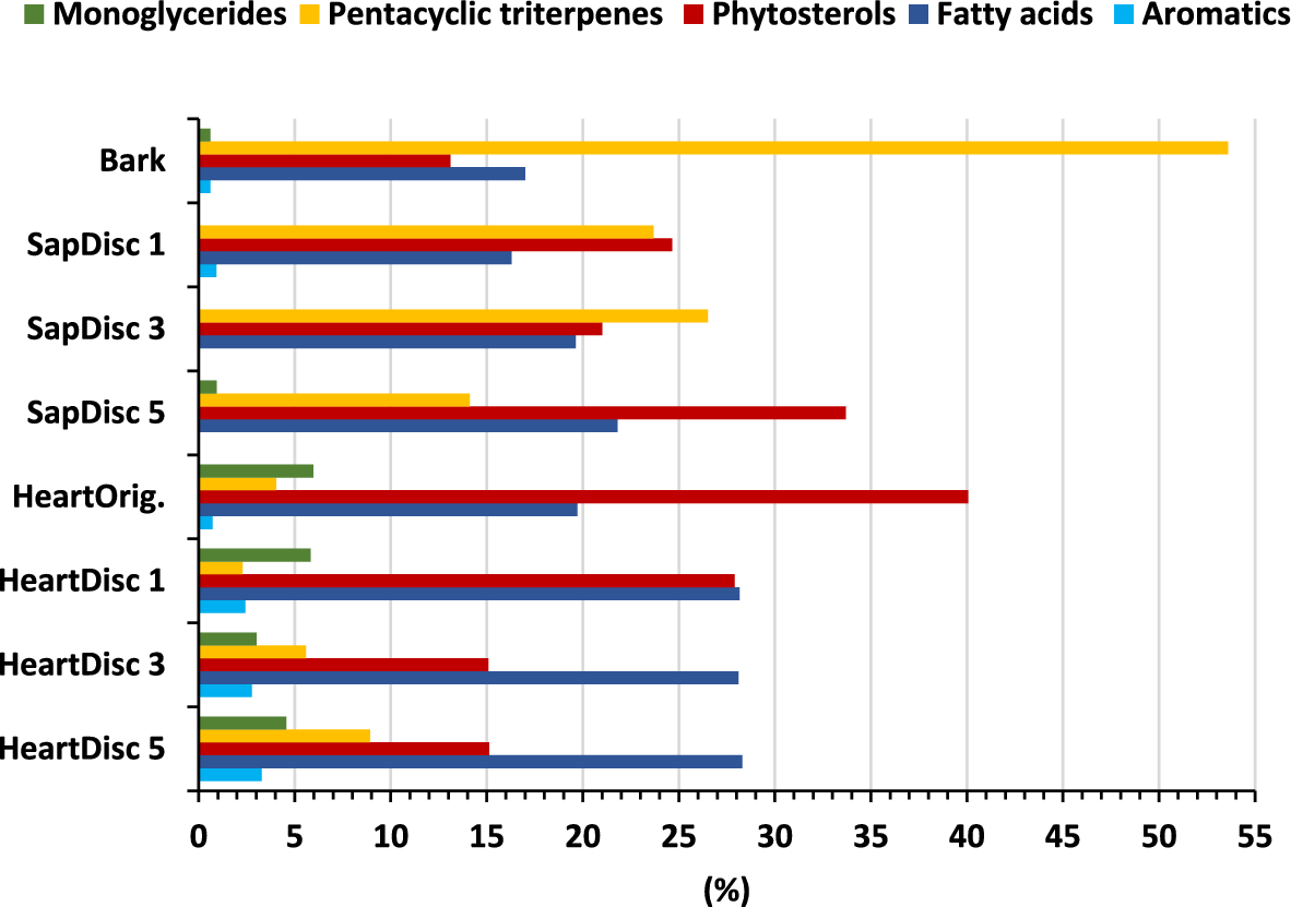 The DCM extracts from all three discs and tissues were analyzed by GC–MS analysis. Around 1 mg of the DCM extracts was derivatized with pyridine (Sigma-Aldrich) and BSTFA (N,O-bis(trimethylsilyl) trifluoroacetamide with 1% trimethylchlorosilane, Sigma-Aldrich) to form trimethylsilyl ethers/esters (TMS). The mixture was heated at 60 °C for 30 min and then cooled to room temperature. The TMS-extracts were injected into an Agilent 7890 A-5975C MSD GC–MS system equipped with a high-temperature capillary column (Zebron 5 HT, 30 m × 0.25 mm × 0.1 μm), using helium as the carrier gas at a constant flow (1 mL/min) in splitless mode. The detailed conditions can be seen in Gominho et al. (2020).