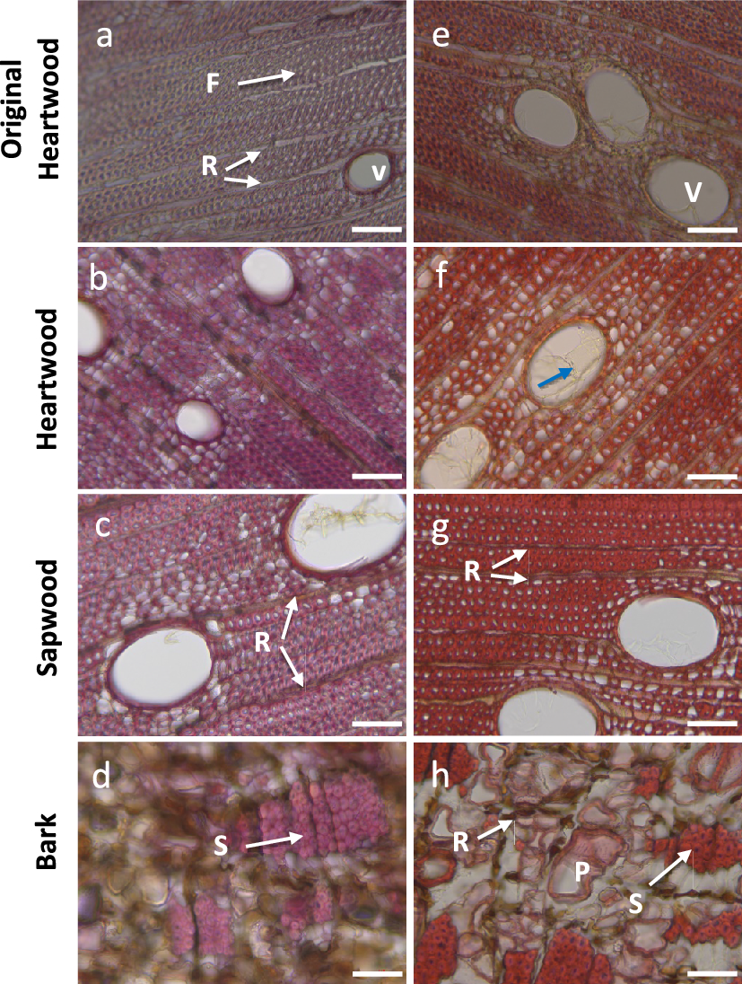 Following Mäule staining (Fig. 5e–h) that gives a purple-red coloration with syringyl unit (Meshitsuka and Nakano 1979), the prevalence of syringyl and guaiacyl lignin types in the cell walls of fibers (F) was evident in original heartwood, heartwood, and sapwood, while vessels (V) and ray cells (R) displayed a G-type lignin, appearing orange to brown as already reported in hardwood vessels (Fergus and Goring 1970; Donaldson 2001). In the bark, sclerenchyma (S) stained red and exhibited lignin of the SG type. Parenchyma cells (P), appearing pink-rose, were at a distinct stage of lignification, while the rays, displaying a brown coloration, were primarily composed of G-lignin. The tyloses observed in vessels of both original and heartwoods (blue arrow) displayed pale staining with Maule reagent. Using an improved Mäule reaction for fluorescence observation, Yamashita et al. (2016) suggested that tyloses differ from vessels in their syringyl proportion.