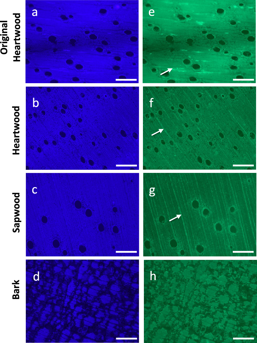 The anatomical studies were made on the tissues collected from Disc 1: sapwood, heartwood, the original heartwood, and bark. Samples were cut into small blocks (1 × 1 × 1.5 cm), then fragments of about 20 mm in length and 3mm in thickness were obtained using blades or saw. The original heartwood could not be cut at once and was conditioned under 85% relative humidity using a solution of KCl. Transverse sections of 30–40 µm thickness were obtained using a microtome equipped with disposable blades (Thermo scientific HM 340E semi-automated microtome). All observations were done using a stereo zoom macroscope (AXIO Zoom.V16, Zeiss) and visible light or fluorescence as described below.