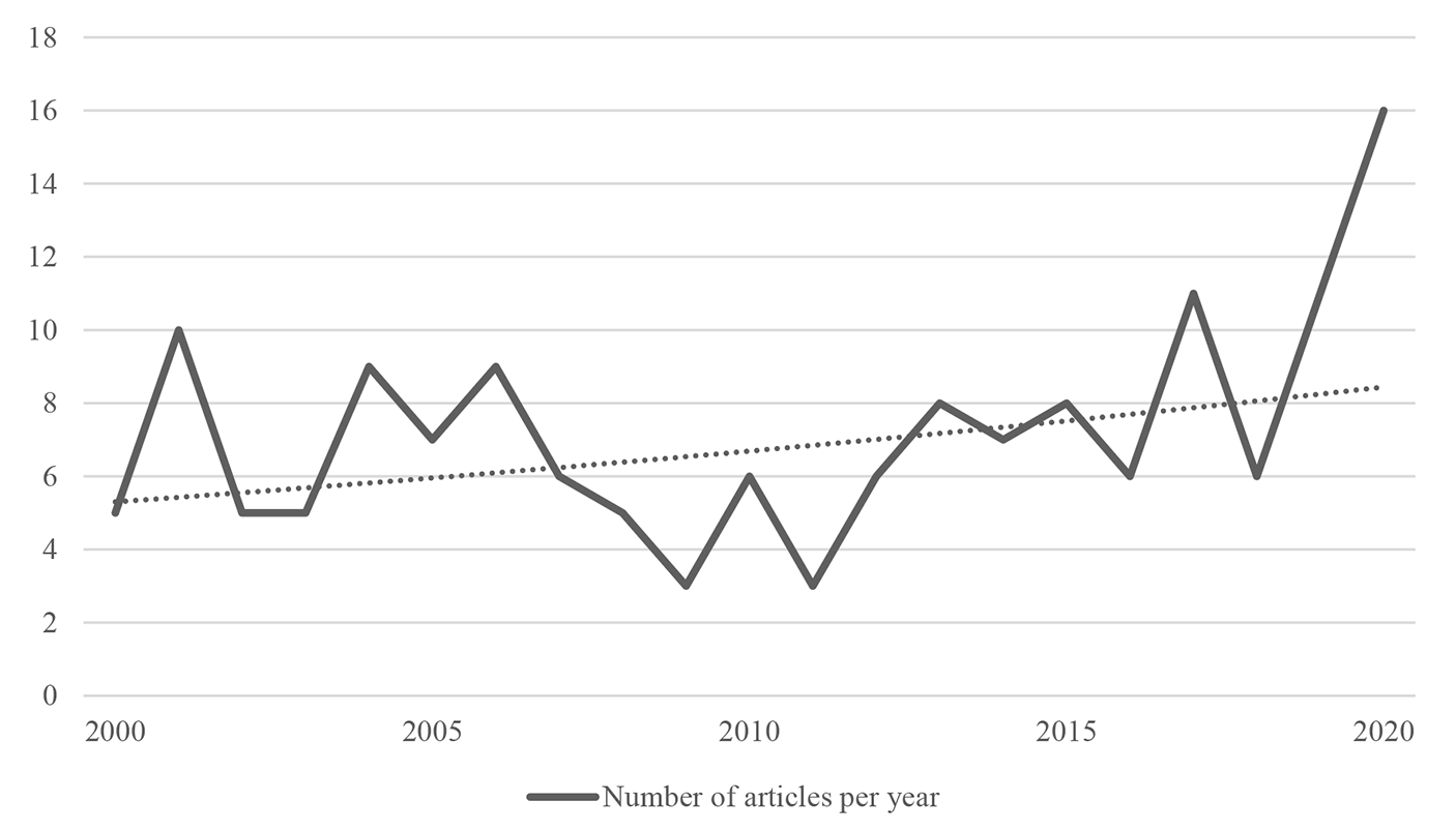 Articles included in the final review per year of publication, 2000–2020 (n = 154) (Source: own elaboration)