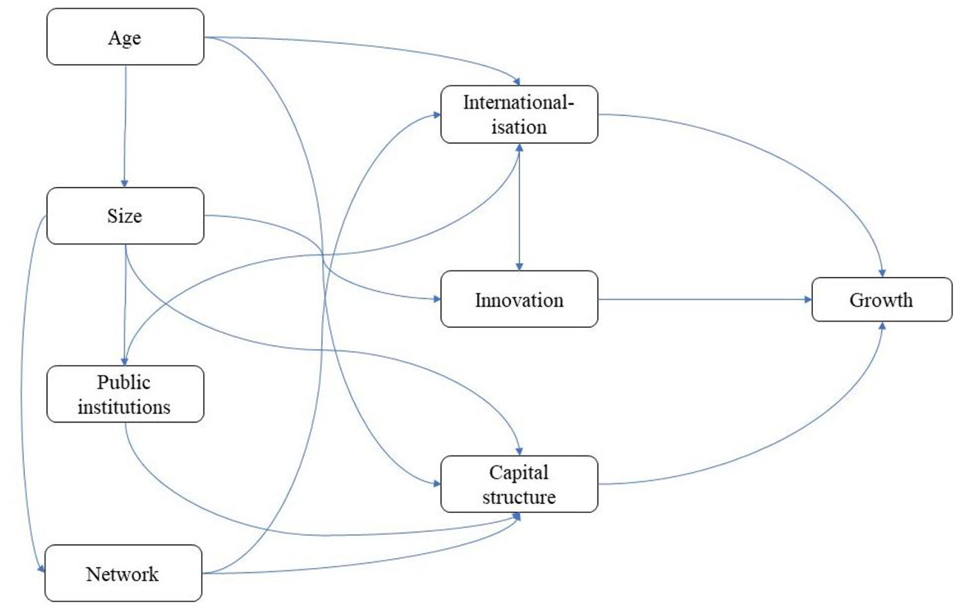 In conclusion, these seven factors influence SMEs and their performance. Experience and size are positive attributes inferring SMEs’ growth. At the same time, firms developing activities in foreign countries and international enterprises tend to obtain better growth rates than those only developing their business in the local market. In addition, alliances and social network can be beneficial for small firms to obtain the necessary resources, such as knowledge on how to do business in international markets, financial resources, or innovative procedures. Innovation helps firms to improve their productivity and grow their performance. On the other hand, smaller firms encounter many barriers, principally in obtaining financial assets, as they are considered riskier than larger enterprises. For this reason, public subsidies could support SMEs to acquire financial resources, implement innovative procedures, expand their business to new markets, and eventually achieve substantial growth rates. Not only do these seven factors have a direct effect on growth, but also are, size, age, internationalization, network, innovation, public institutions, and capital structure influencing each other and hence improve their effect on performance (see Fig. 2). For example, firms’ age and size influence growth in a stronger manner than age by itself.