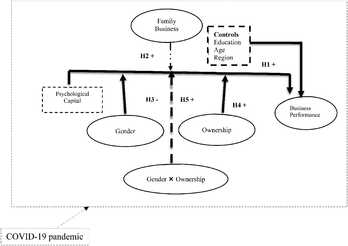 Our results significantly contribute to the existing body of literature on the impact of PsyCap on family businesses operating in an emerging economy, which has been an under-researched area. We gathered data during the COVID-19 pandemic to measure the impact on family businesses during a crisis scenario. By shedding light on the role of Psychological Capital and its interaction with family businesses, gender, and ownership structures in influencing business performance, our research aims to provide valuable insights for scholars and practitioners alike. Our research model is below (See Fig. 1).