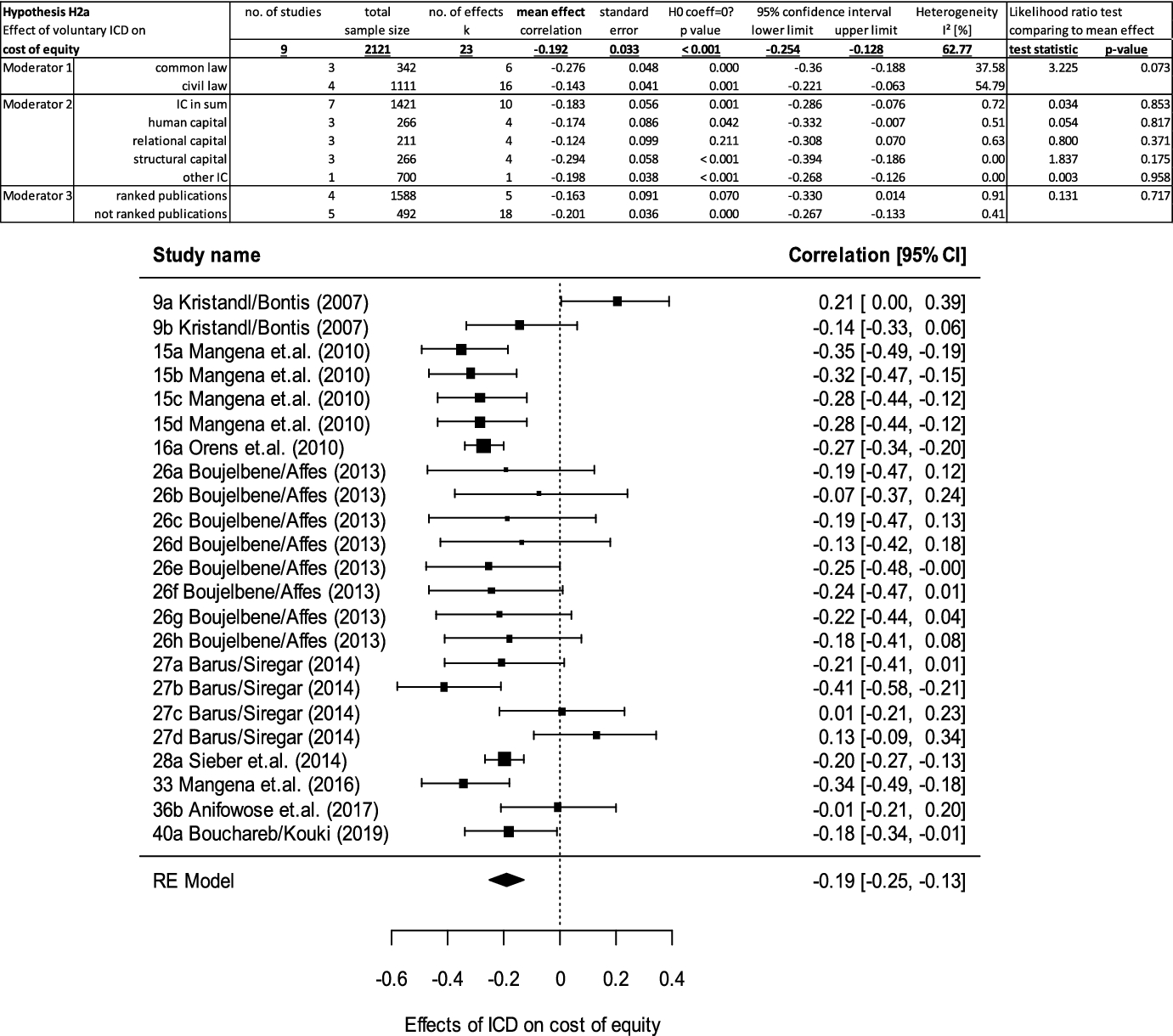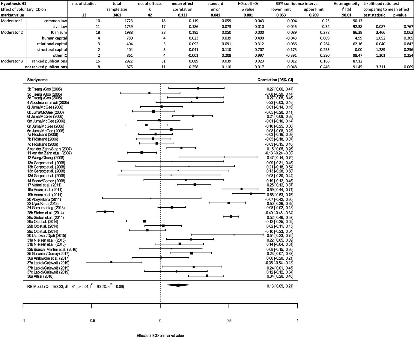The existence of such mixed results calls out for a quantitative integration of evidence by a meta-analysis. Variables for explaining inconclusive results are moderating factors originating from different study designs or other factors of interest such as the legal origin (La Porta et al. 2008). Unlike narrative reviews, meta-analyses are capable of statistically integrating effects, identifying variances of study results due to sampling or measurement errors and testing for potential moderating variables across studies (Buckley et al. 2014; Khlif and Chalmers 2015; Schmidt and Hunter 2014).