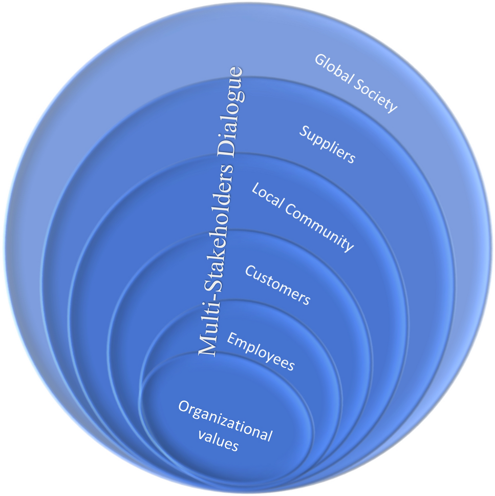 De Geer (2009) talked about the “license to operate” as a continuous legitimization and communication process, thereby determining a company’s vision and mission, in terms of its ethical, environmental, and social responsibility to its stakeholders, including society. The mission and values of an organization in turn guide the legitimization and communication process—the “license to operate”—which negotiates the shift from a firm-centric view, in the neoclassical model, to a stakeholder orientation with a more societal perspective. Edvardsson & Enquist (2009) highlighted the contrast between values resonance as the dialog about a company’s core, foundational values (Waddock & Bodwell, 2004), and societies and customers’ values, which are based on “shared values and shared meanings.” Similarly, Waddock & Rasche’s (2012) stakeholder view of a “responsible enterprise” includes both the stakeholder relationship (Høvring et al., 2018) and the operating practices (policies, processes, and procedures). Laczniak and Murphy (2012) also expounded a stakeholder view, advancing three characteristics of a stakeholder orientation: (1) it is rooted in a normative ethical standard of distributive justice; (2) it comprises a broader and deeper view of the societal mandate; and (3) it prescribes greater engagement with external stakeholder networks, rather than an exclusive focus on customer concerns in an exchange process.