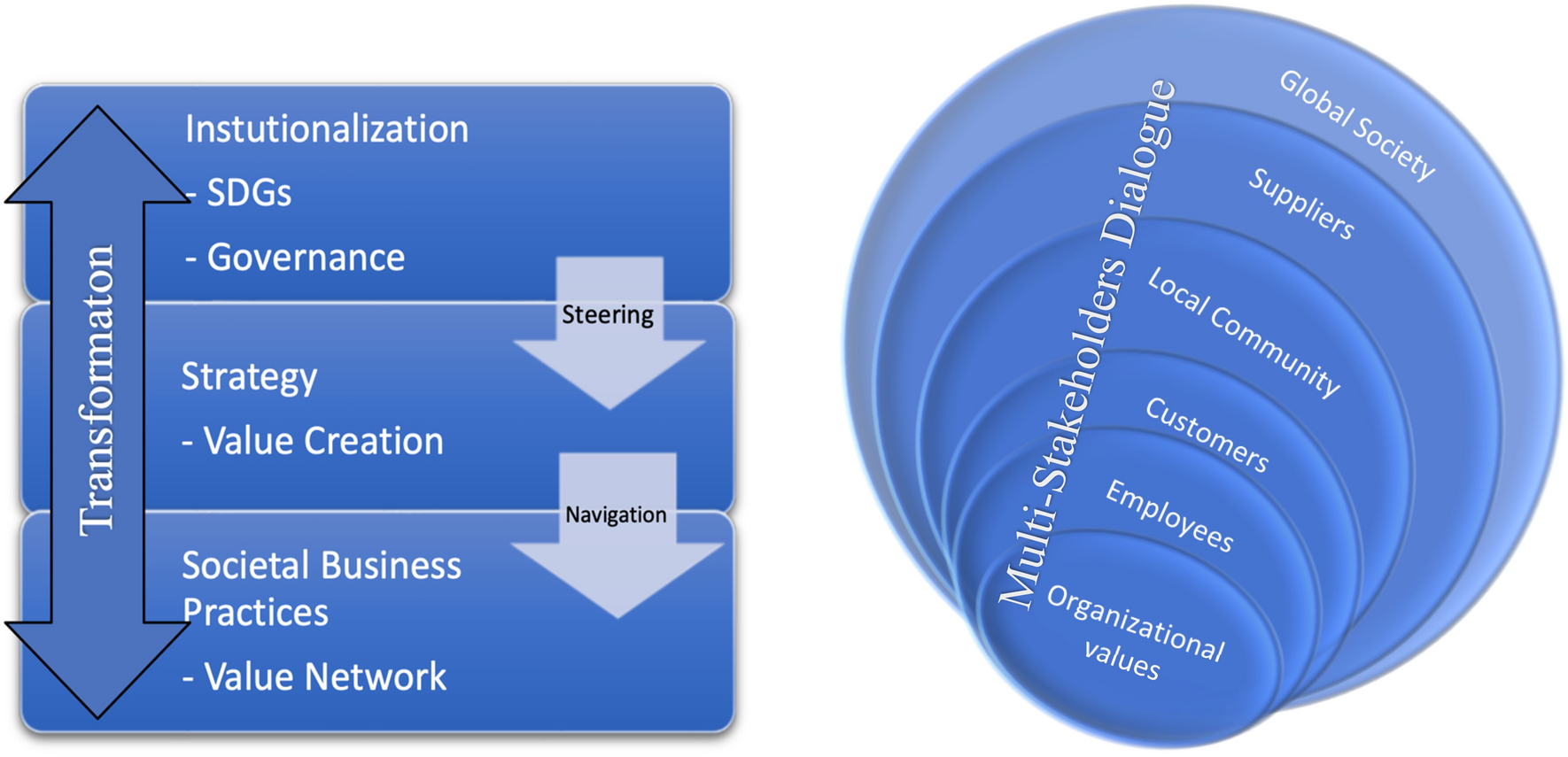 Steering and navigating in a value network based on resource integration is beneficial from a value-creation perspective, both for customers and other stakeholders. However, transformative change in businesses must embed social and environmental perspectives and governance issues in order to overcome key challenges. This is something that both our case companies are addressing. Steering organizations toward achieving the SDG goals should be understood as a fundamental part of good governance and sustainability. The business transformation should also be about navigating, via transformational management, the new landscape of the SDG challenges, through different networks based on business-societal practices or CSR. Organizations need to steer and navigate, through values-based thinking and multi-stakeholder dialog, the shift toward the societal perspective brought about by the institutionalization of the SDGs (see Fig. 2).