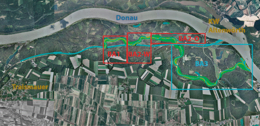 LIFE+-Projektgebiet im Mündungsbereich des Flusses Traisen mit den Bauaubschnitten BA1, BA2 West, BA2 Ost und BA3 (verändert aus Ezb TB Eberstaller 2012)