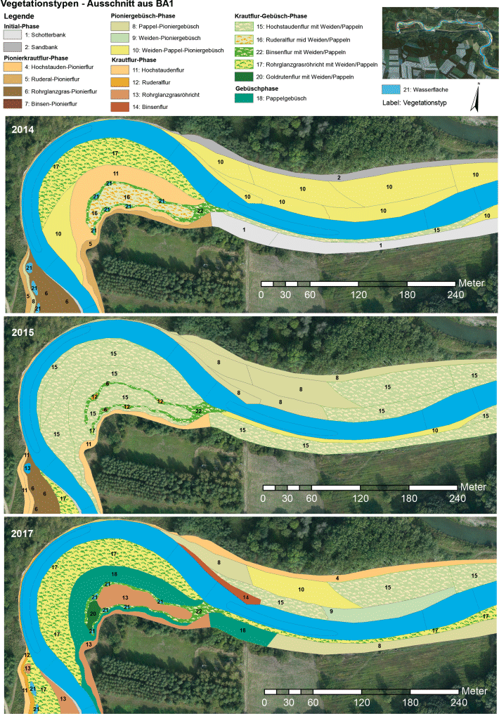 Eine der vegetationsökologischen Kernfragen dabei ist, inwieweit sich standorttypische Gehölze über Naturverjüngung etablieren können und inwieweit es nach Abschluss der Bauphase 2017 absehbar ist, dass sich mittelfristig über die natürliche Sukzession Weichholzauen (prioritärer FFH-Lebensraumtyp 91E0* „Auenwälder mit Alnus glutinosa und Fraxinus excelsior (Alno-Padion, Alnion incanae, Salicion albae“)) etablieren können. Im Speziellen geht es dabei um Fragen der Konkurrenz mit Hochstauden und Röhricht-Arten, insbesondere auch um das Aufkommen von Neophyten sowie um die Wirkung des Wildverbisses (Mayer 2018). Zusätzlich soll abgeschätzt werden, inwiefern die Flussdynamik wieder neue Offenstandorte und damit potenzielle Keimstandorte für die Baumarten der Weichholzaue schafft und so langfristig auch eine Verjüngung der Weichholzau gegeben ist. Dazu wurden mit Abschluss der Bautätigkeiten im ersten Bauabschnitt BA1 im Westen des Gebietes im Jahr 2014 bis nach Abschluss des letzten Bauabschnittes BA3 mit dem Anschluss an die Donau im Osten Ende 2016 ein begleitendes vegetationsökologisches Beweissicherungsprogramm durchgeführt.