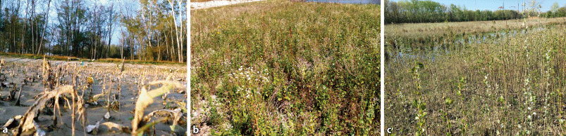 Im Bauabschnitt Mitte West (BA1) wurde 2017 bei der Wiederholung der Kartierung ein Goldrutenvorkommen im Ausmaß von mehr als 5 % auf 0,5 ha registriert. Im Jahr 2015 betrug die Fläche 0,7 ha. Die Goldrute gilt als invasiver Neophyt (Essl und Rabitsch 2002) und dringt ausgehend von der umliegenden Hartholzau auf die Eingriffsflächen neben der neuen Traisen ein. Im Bauabschnitt Mitte Ost (BA2) stieg der Anteil der Flächen mit einem Goldrutenanteil (Solidago gigantea und S. canadensis) von mehr als 5 % von ca. 2 ha (2015) auf 3,1 ha (2017). Der BA3 weist mit 6,8 ha den höchsten Anteil an Goldrute auf (mehr als 5 %) (siehe Abb. 9).