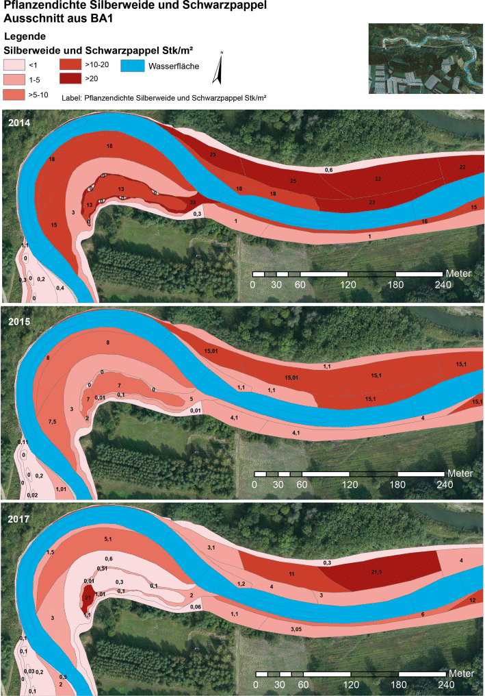 Ausschnitt aus BA1 aus der flächendeckenden Kartierung Pflanzendichte der Schwarz-Pappel und Silber-Weide für die Jahre 2014, 2015 und 2017 (Datenquelle Aigner et al. 2014; Kreuzberger 2017; Egger und Mayer 2018; verändert aus: Mayer 2018)