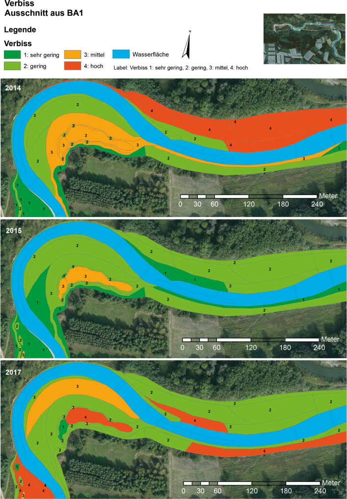 Der Schutzzaun wurde 2015 beschädigt und teils geöffnet. In Folge zeichneten sich 2017 BA1 + BA2 West und BA2 Ost durch ähnliche Verbissanteile aus. In Summe überwiegen die geringen bis mittleren Verbissgrade (auf ca. 2/3 der Flächen) und die hohen Verbissgrade (auf ca. 1/3 der Flächen).