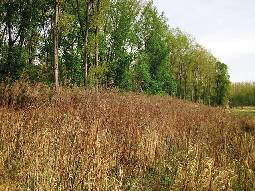 Junges Pappelgehölz (ca. 3 Jahre alt) mit verbissener Triebspitze (rechts im Bild), links Pappelgehölz mit Geschwemmsel vom letzten Hochwasser