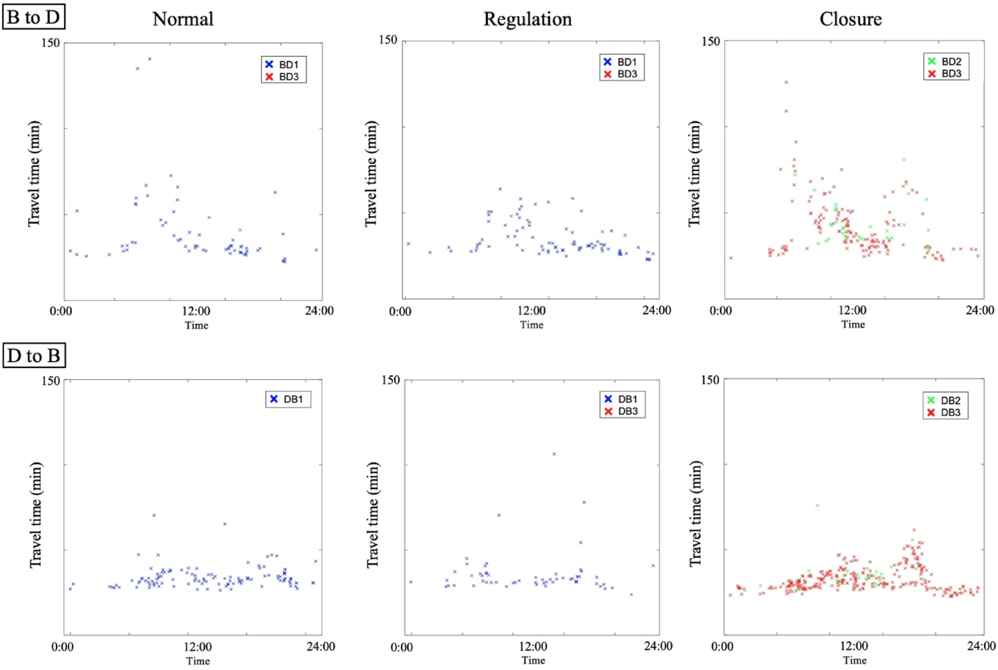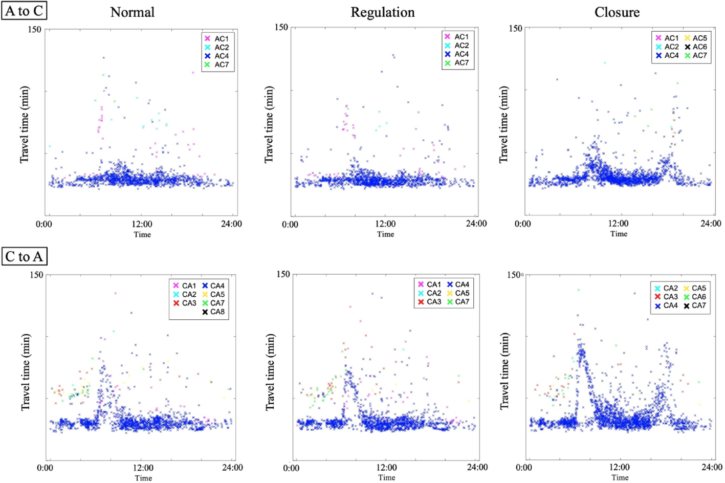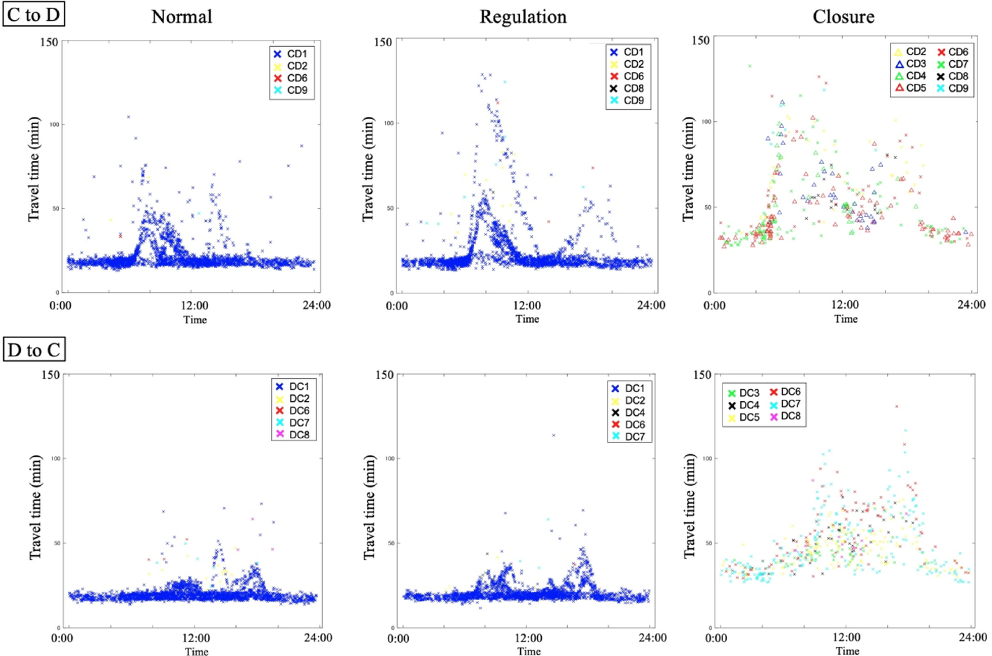 Consistent with the trends observed during the normal and regulation periods, the closure period also exhibited a morning peak in the C to D direction and an evening peak in the D to C direction. Additionally. The distribution of travel times between the other gate pairs is shown in the appendix. For gate pairs A and C, the most commonly used routes remained the same; however, the peak hour in the travel time distribution was more pronounced at road closures. For gate pairs B and D (particularly D to B), the routes used have changed; however, it can be seen that few vehicles have a significant increase in travel time at road closures.