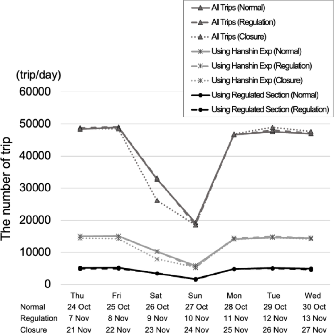 A normal week without restrictions, a week with lane restrictions, and a week with road closures before and after the construction period in 2019 were set for analysis as follows: