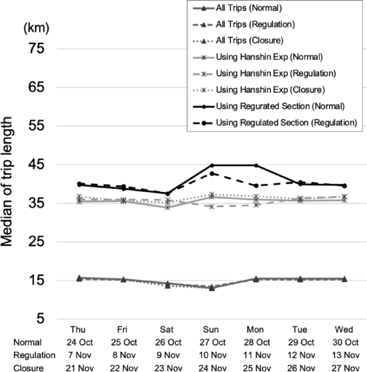 Many analyses have been based on observational surveys and questionnaires to understand traffic conditions before and after the actual traffic control period. Compared with trajectory data, questionnaires are more likely to ask about intentions and reasons for actions; however, they are also more dependent on respondents’ memories and less likely to be accurate. Hunt et al. (2002) studied the impact of the closure of Centre Street Bridge in Calgary, Canada. This was a 14-months closure of cars and trucks owing to major road repairs that started in August 1999. Observational data before and during the closure, as well as driver interviews, revealed that only a few drivers changed their traffic mode or canceled their trips. The main responses were to find another route to the same destination and to shift the departure time to avoid traffic congestion. Zhu et al. (2010) studied the traffic behavior in response to the collapse of the Mississippi River Bridge using loop detectors, bus users, and survey data during the weeks leading up to equilibration. The traveler’s typical reaction to a bridge collapse was to change routes and departure times, and few changed their traffic mode to public transportation. Tennøy and Hagen (2021) investigated user adaptations to a 14-months capacity reduction in a tunnel with 70,000 vehicles per day in Oslo, Norway. Traffic volume and speed data based on surveys conducted every two weeks and user interviews were analyzed. In response to long-term capacity reduction, users showed adaptive behaviors such as changing traffic modes to public transportation and bicycles. Such behavioral changes were not observed in the analyses of unexpected short-term network disruptions. The survey revealed long-term behavioral changes.