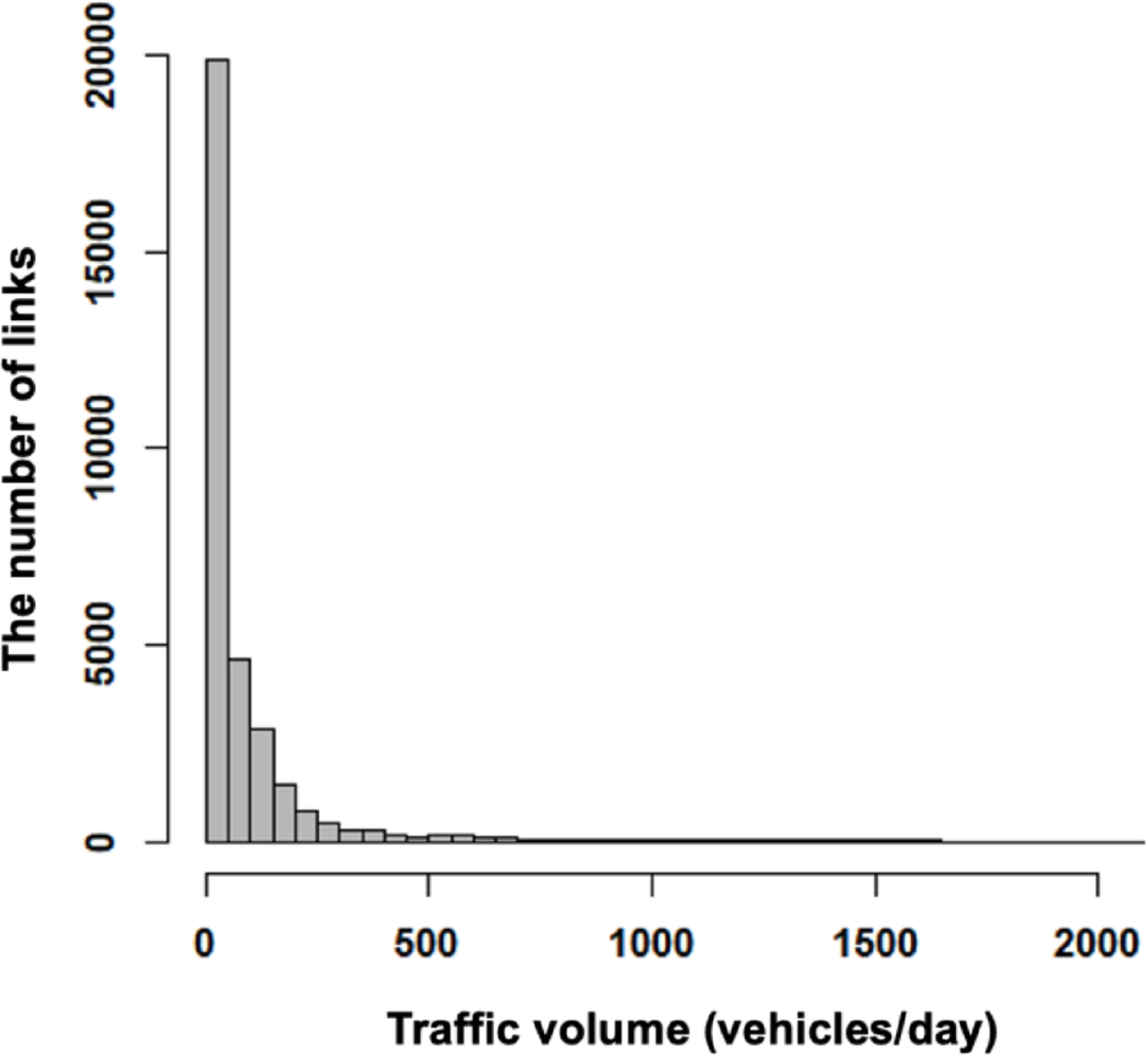 The number of days was the same for the comparison. During the designated three-week period, a total of 867,330 trip IDs and 222,851 vehicle IDs were recorded. Trends in the number of trips and trip lengths were examined for all trips, those using the Hanshin Expressway, and those using the construction section. The results showed that the number of trips decreased on weekends in all groups. The median trip length using the construction section exhibited a slightly different trend from that of the other groups. On some days, the trip length was longer during the normal period than that during the restricted period. However, we found no significant change in the number of trips and median trip length, regardless of the implementation of lane restrictions and road closures. Therefore, a few vehicle users canceled their trips or changed their destinations, and many vehicle users may have changed their route or the time of using the route. (Detailed numbers are shown in Figs. 11 and 12 in the Appendix.) The trend in the number of trips remained unchanged, regardless of serious lane restrictions and road closures. To summarize the changes in traffic situations due to lane restrictions and closures, we show the results of the change for each road section (link) on the road network. As mentioned in Sect. “Vehicle-trajectory data and road networks”, it was assumed that the trajectory data used in this study had already been matched to the links in the road network. Before describing the change analysis, situations on a normal day without restrictions can be observed from the trajectory data within the target area. On Thursday, October 24, 2019 (the first day of the analysis period), the number of links with one or more vehicles observed on that day was 31,782, more than half of which had daily traffic volumes of 50 vehicles or less. The number of links with traffic volumes below 50 (vehicles/d) is particularly high. A histogram of the link traffic volume for that day is included in the Appendix. Because commercial vehicle probe data with this observed situation were used in this study, weekly traffic volumes (vehicles/week) were analyzed to verify the impact of lane restrictions or road closures. In addition, to set the target links where the traffic volume was above a certain level, links with an average daily traffic volume of 50 vehicles or more (350 vehicles/week) in any week during the normal, lane restriction, and road-closure periods were included in the analysis. The number of links analyzed in the road network was 11,360 (expressways: 2.3%; urban expressways: 6.9%; national roads: 28.9%; main prefectural roads: 30.2%; main city roads: 9.1%; prefectural roads: 6.3%; city roads: 1.9%; others: 14.3%).