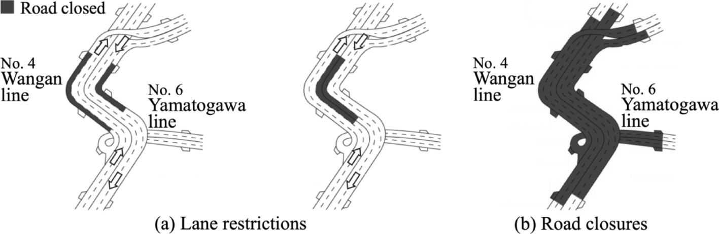 One-lane restriction (daytime) and two-lane restriction (nighttime) in the 4.7 km section of the No. 4 Wangan Line operated for 14 d from November 6–20, 2019. The road closures in the 8.8 km section of No. 4 Wangan Line and 1.4 km section of No. 6 Yamatogawa Line operated for 10 d from November 21–30, 2019. Figure 1 shows the lane restrictions and road closures. The shaded areas in Fig. 1 are under construction and impassable to all vehicles. Lane restrictions close either the outer or inner lanes of each three-lane carriageway, so traffic is confined to the remaining lanes. Although the closure pattern differs between outer and inner lanes, capacity is reduced by about two thirds during the day and by one third at night. During the full-closure period, all lanes are shut and the road is completely impassable, as shown on the right-hand side of Fig. 1. The Hanshin Expressway is a toll road. During the road-closure period, a system that provides a detour route and does not charge a new toll for getting on and off within four hours was introduced.