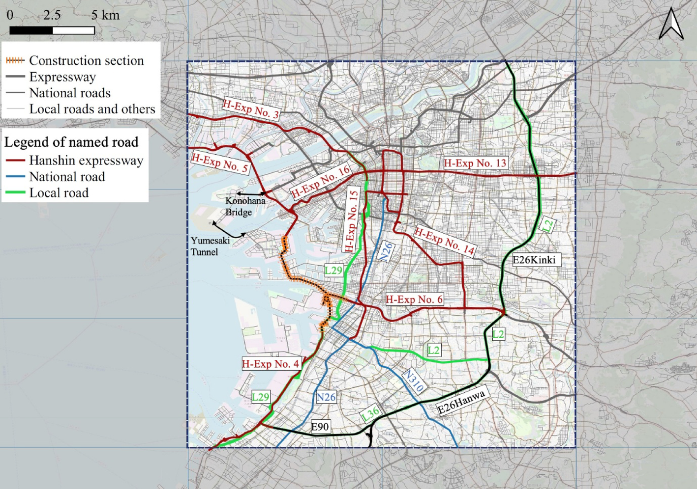 The Hanshin Expressway No. 4 Wangan Line, where the renewal project was conducted, is located in Osaka and Sakai City, Japan. As shown in Fig. 2, the analysis in this study covered an area of approximately 20 × 30 km, including the regulated area. The black and orange dashed lines represent regulated roads that are expressways. Other roads indicate their type based on their thickness. Some roads in the target area were named to explain the results of the analysis found in this study. The construction project involves a major expressway with high traffic volumes and is implemented over an extended period, not just a few hours. For such large-scale construction projects with traffic restrictions, it is essential to evaluate not only the localized impacts (e.g., congestion near the work zone) but also the broader network-wide effects. This allows us to capture potential widespread detour behaviors. While expanding the target area inevitably introduces the influence of other factors, it allows for insights that would not be attainable through an analysis limited solely to the vicinity of the construction zone. The vehicle-trajectory data for all trips through the links in the target area were used for the analysis.