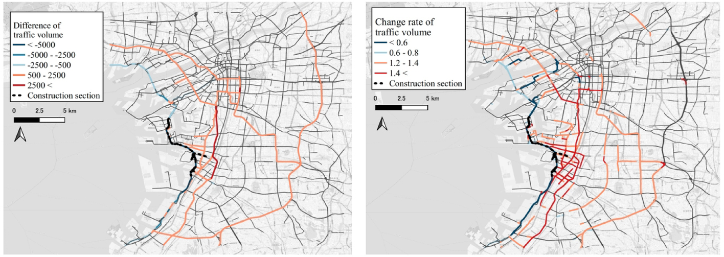 The rates of change and differences in traffic volumes indicate that the affected ordinary roads are mostly around construction sections, whereas their impact on expressways is widespread. The variation in the rate of change was particularly large for urban expressways (the Hanshin Expressway in this case).