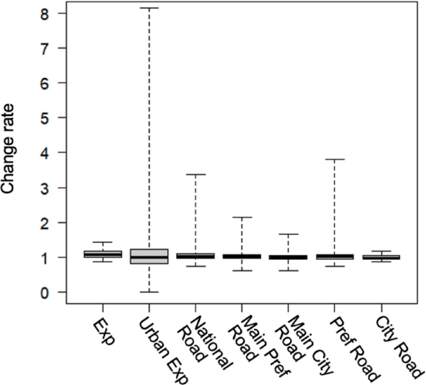 The relationship between \({R}_{a}\) and road type was verified. Figure 4 presents a boxplot of \({R}_{a}\) for each road type. The quartile range shows that the range is very narrow, except for the urban expressway (Hanshin Expressway in the target area), and most links have a change rate close to 1. Very few links within each road type exhibited high rates of change. In particular, expressways and city roads do not have links that show large rates of change, in terms of either increase or decrease. In contrast, the urban expressways had the widest range of maximum and minimum values, indicating that the fluctuation was the largest among the road types. The impact of traffic reduction caused by road closures is not significantly different for all types, except for urban expressways, which include closed sections. However, there are links that have been significantly affected by increased traffic volumes on national and prefectural roads, other than urban expressways. As with spatial considerations, the impact on the increased side of the traffic volume affects a wide variety of road types, whereas the impact on the decreased side is confined to a limited road type. The verification of these relationships shows that the impact of road closures varies according to road type.